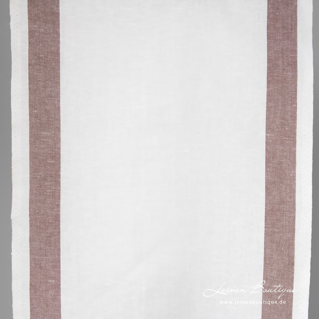 Schneeweißes Halbleinen mit braunen Streifen an den Kanten (breite 5cm). Der Stoff, den wir in Köperbindung gewebt haben, ist besonders reißfest, dicht. Ideal für Geschirr- und Küchentücher.