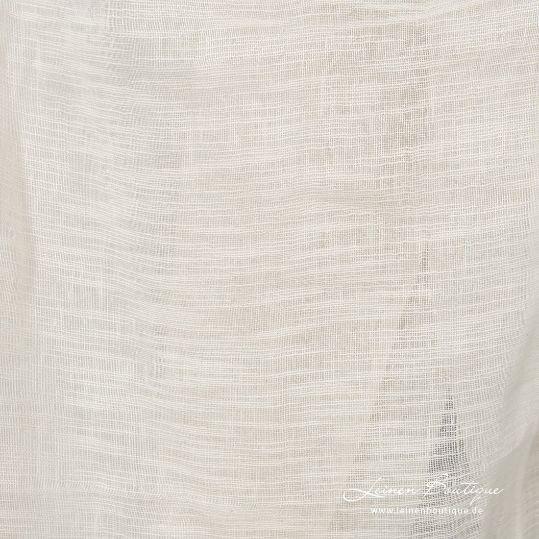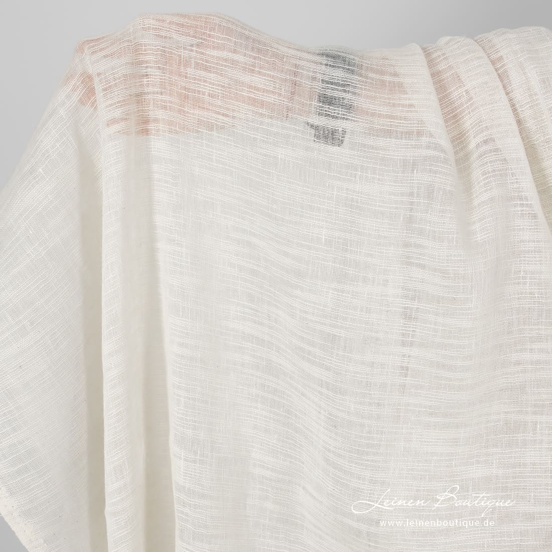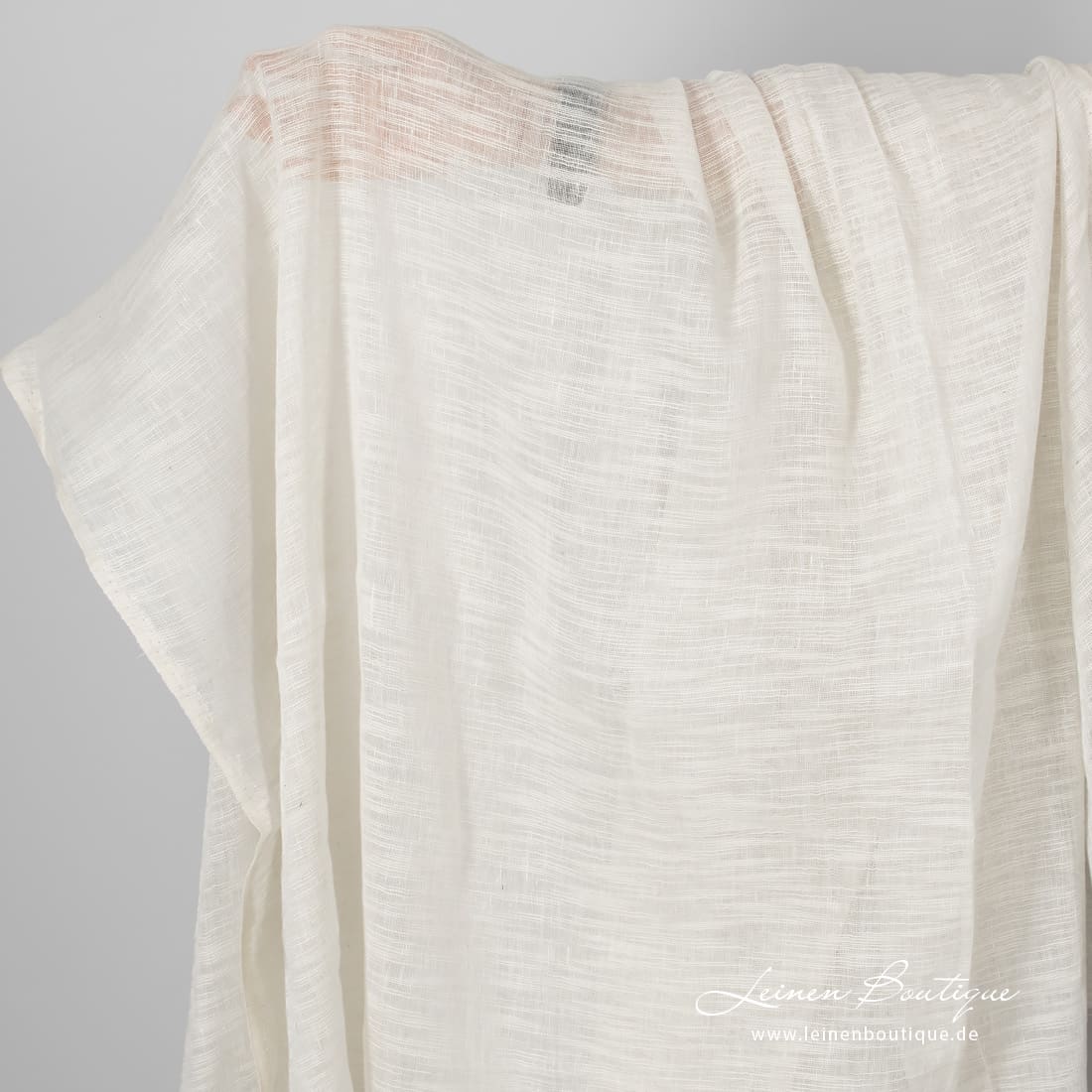 Transparentes Halbleinen in Milchweiß (Gelblichweiß), geflammt. Das unregelmäßige Streifenmuster haben wir mit der Hilfe von Effektgarn mit speziellen Verdichtungen gewebt. Leichter, offen gewebter, durchsichtiger Leinen-Baumwollstoff passt zum Nähen von Gardinen und Schals.