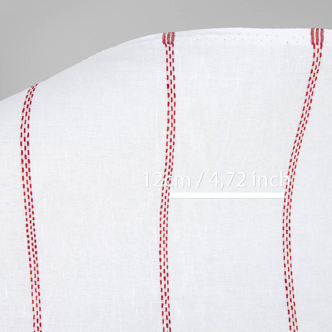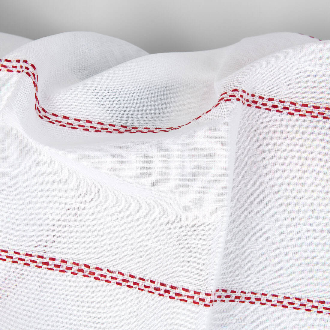• Weißes Halbleinen mit roten Streifchen ist zum Nähen von Kleidung und Heimtextilien geeignet