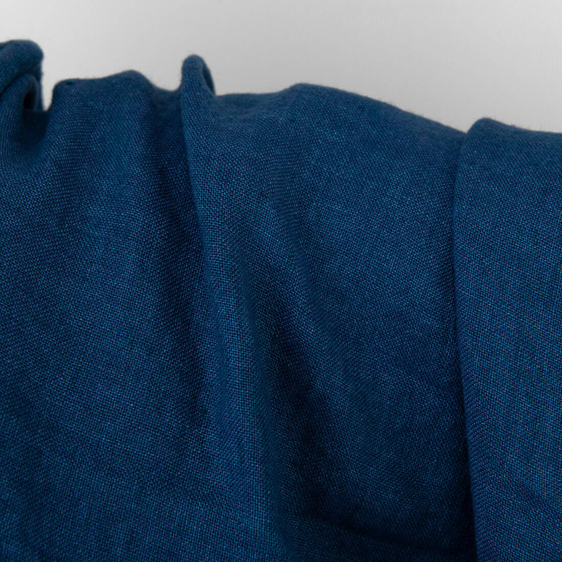 Leinenstoff in sattem Blau. Die Farbe haben wir mit der Hilfe von dunkelblauem und dunkeltürkis Leinengarn bekommen. Das Einlaufen wurde durch industrielles Waschen eliminiert.
