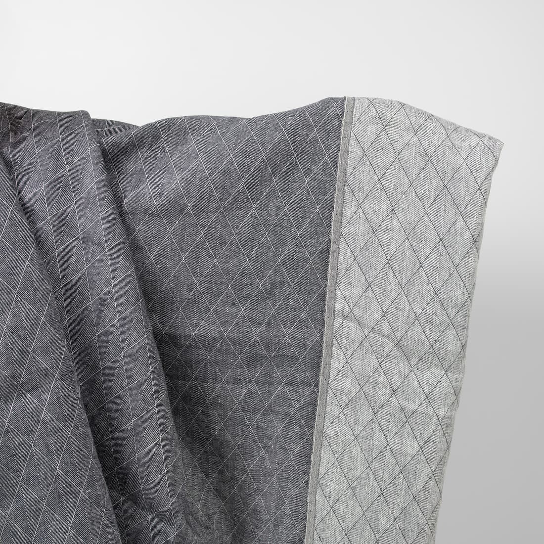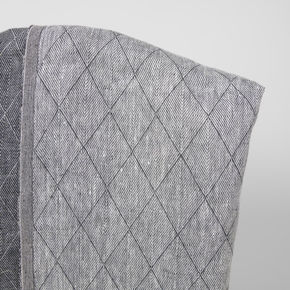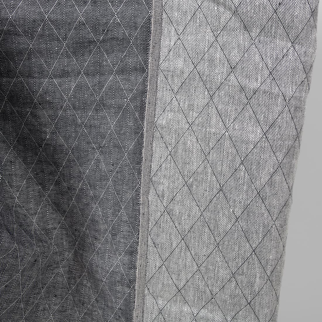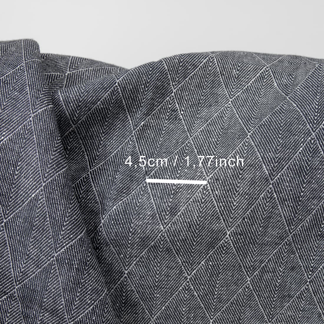 Reinleinen-Jacquardstoff wurde aus dunkelblauen und weißen Leinengarnen gewebt. Gestreiftes Diamantmuster ist beidseitig gewebt: auf einer Seite in blauen und im Revers in weißen Farbtönen. Reißfester, dicker, schwerer Leinenstoff.