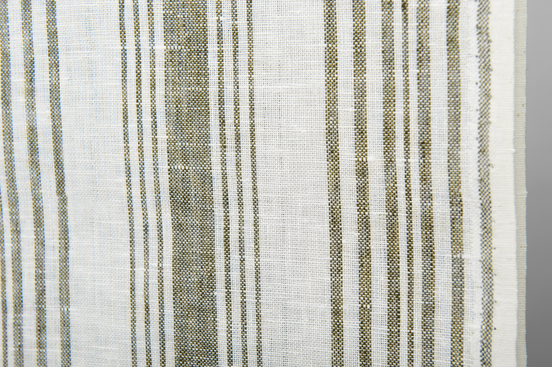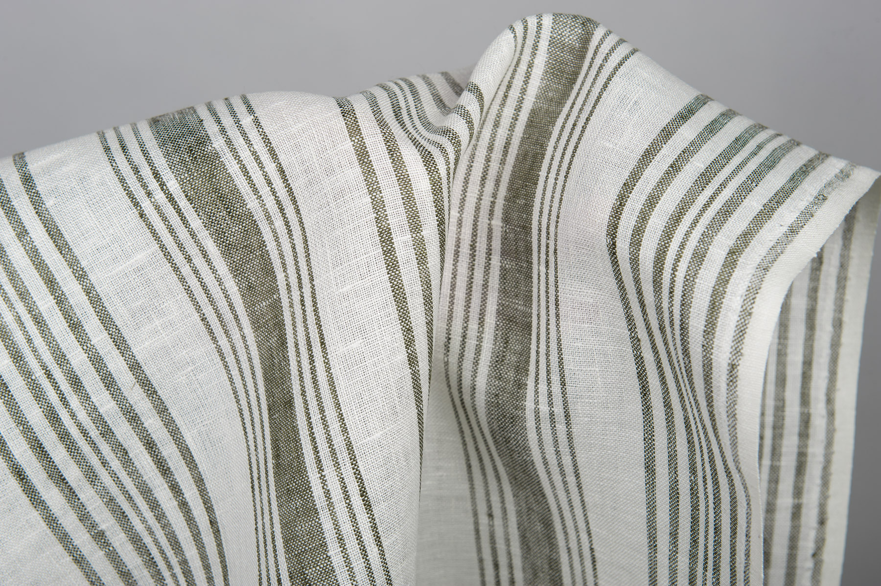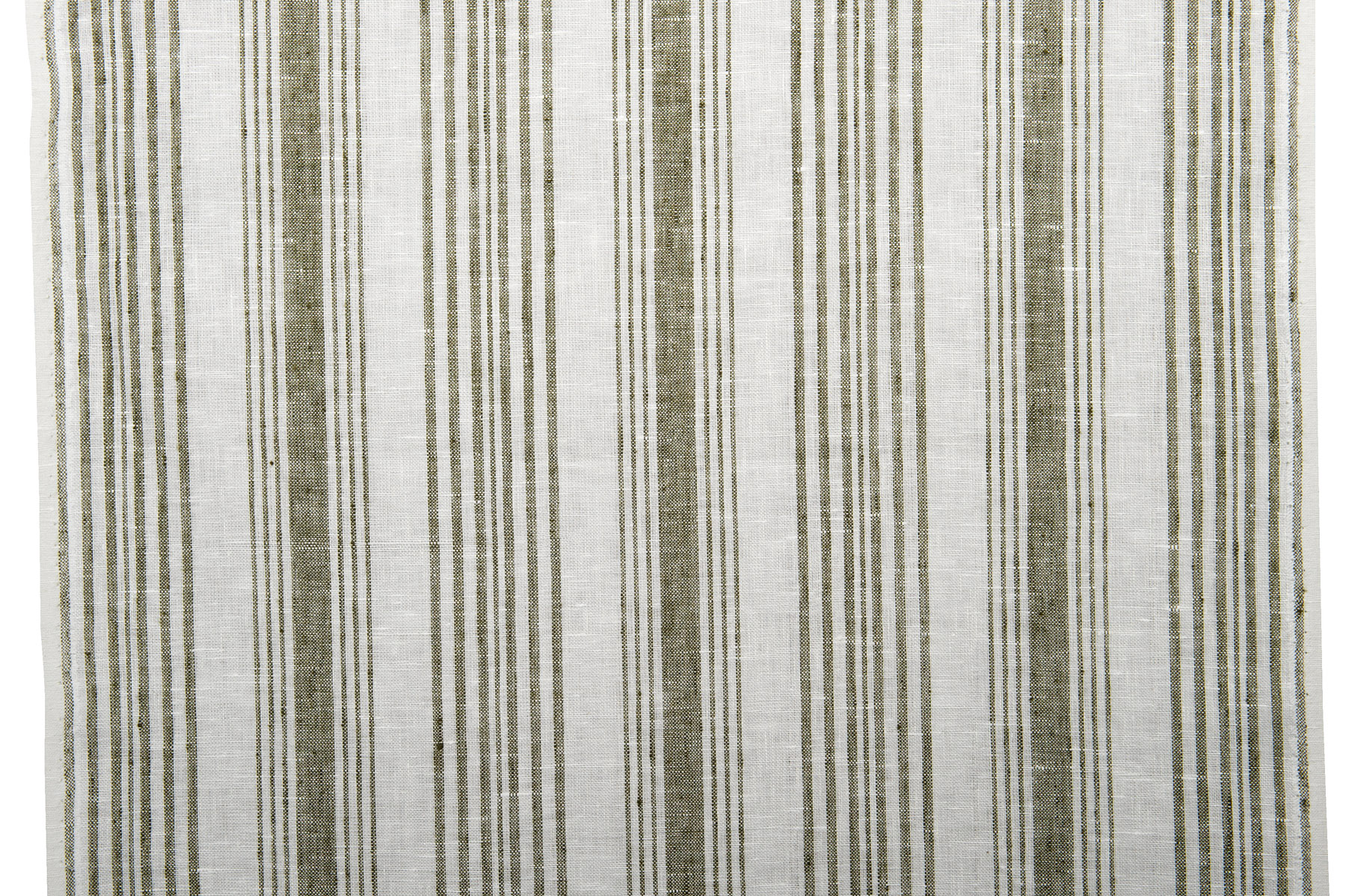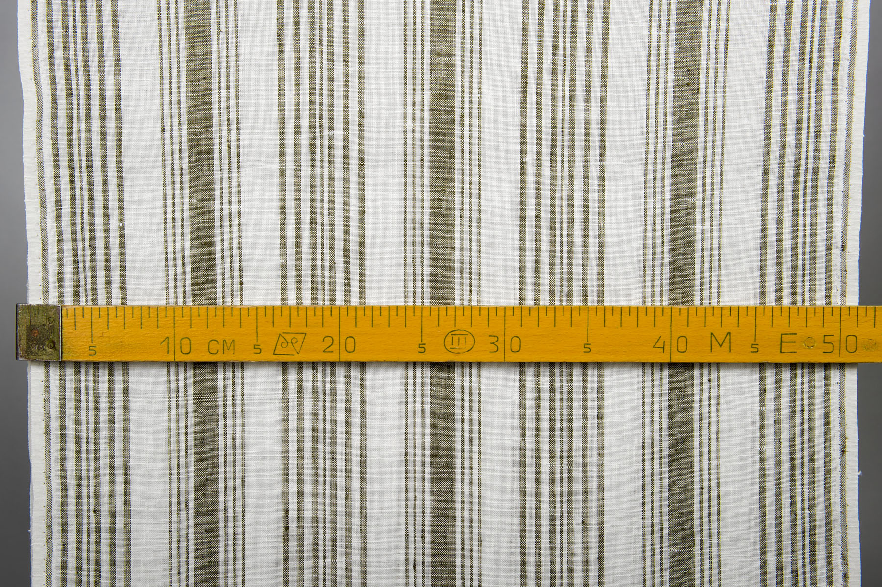 Milchweißer (gelblich weißer) Leinenstoff mit khakigrünen (braungrünen) vertikalen Streifen. Breite 50cm, dichtes Weben, Reißfestigkeit des Reinleinens: dieser Stoff ist optimal zum Nähen von Geschirr- und Küchentüchern.