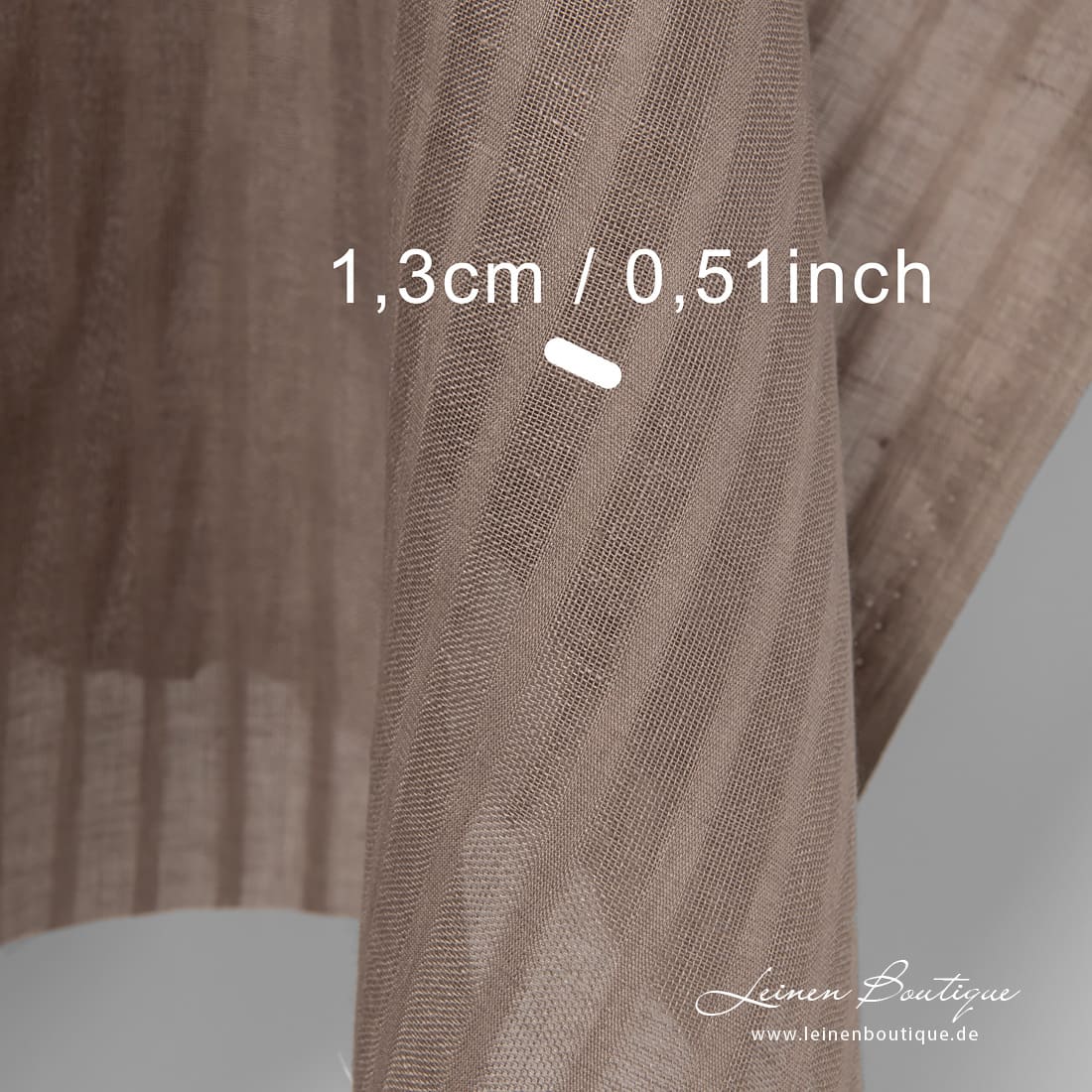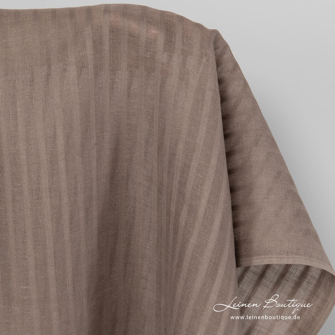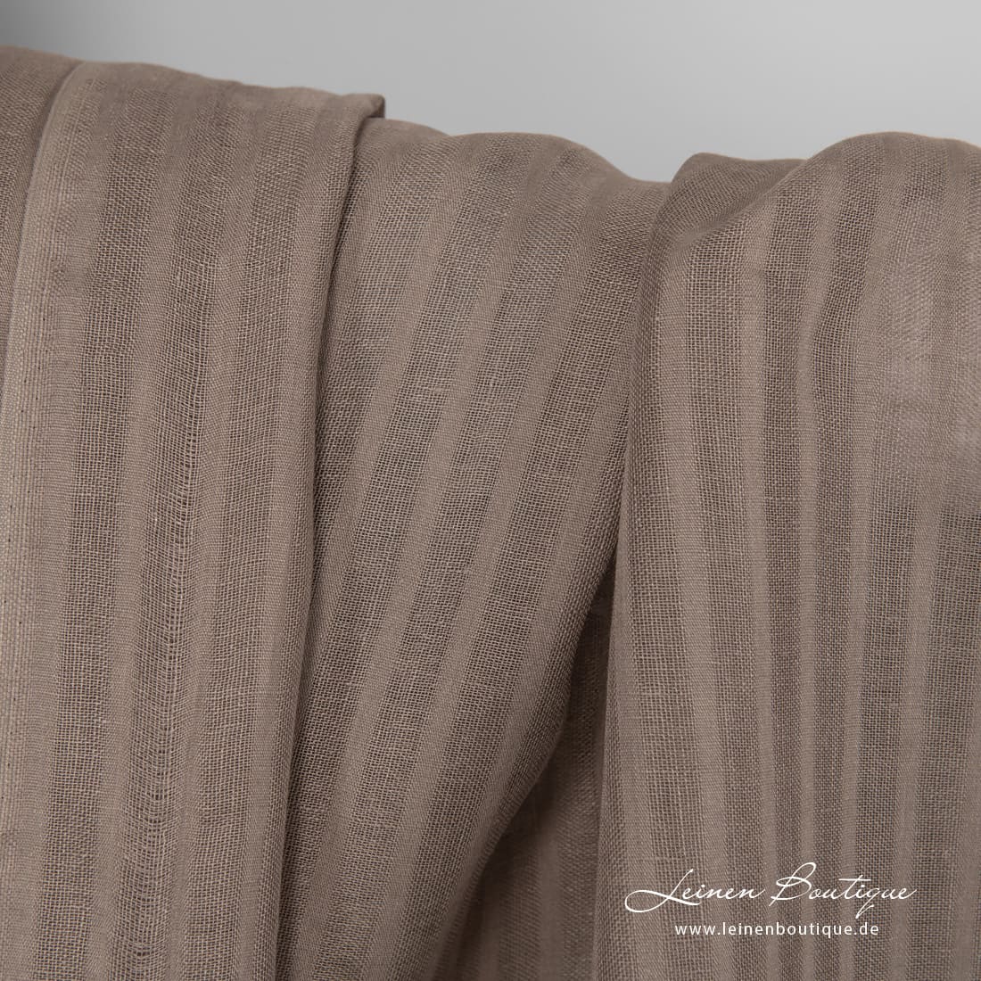 Bräunlichgrauer Leinenstoff mit Ajour-Streifen, in dem Stoff vertikal gewebt. Das Reinleinen ist leicht, zum Nähen von Heimtextilien passend.