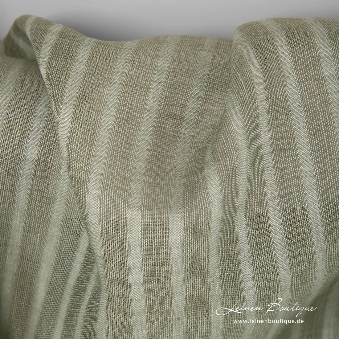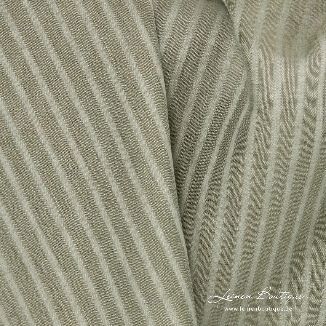 Grünlicher Leinenstoff mit Ajour (durchsichtigen) und dicht gewebten vertikalen Streifen. Aus altgrünem und hellem mintgrünem Garn gewebt. Das Reinleinen ist leicht, zum Nähen von Gardinen, Schals, Tüchern geeignet.
