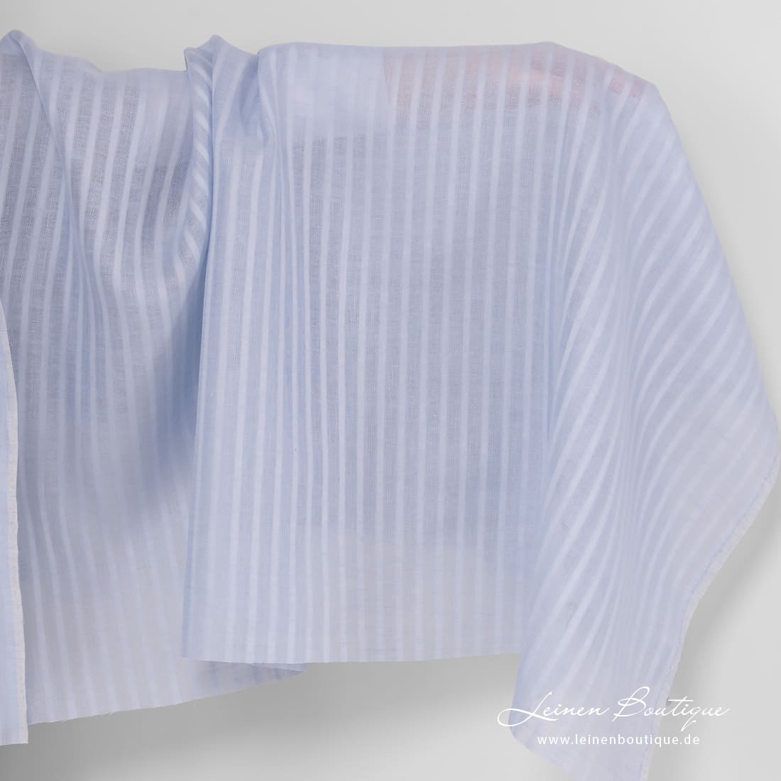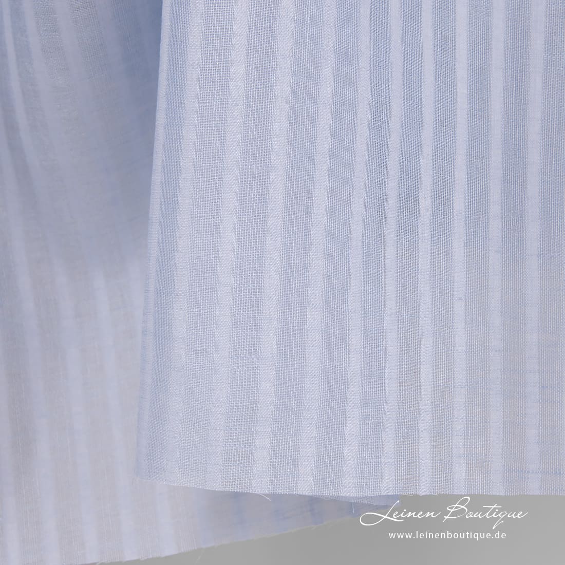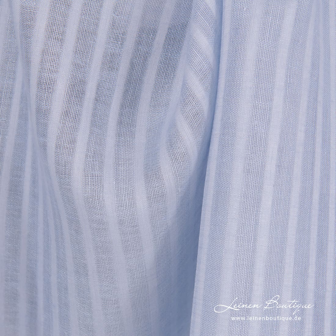 Himmelblauer Leinenstoff mit Ajour (offen gewebten, transparenten) und dichten vertikalen Streifen. Aus hellblauem und bläulichgrauem Garn gewebt. Das leichte Reinleinen passt zum Nähen von Gardinen, Schals, Tüchern, Tischdecken.