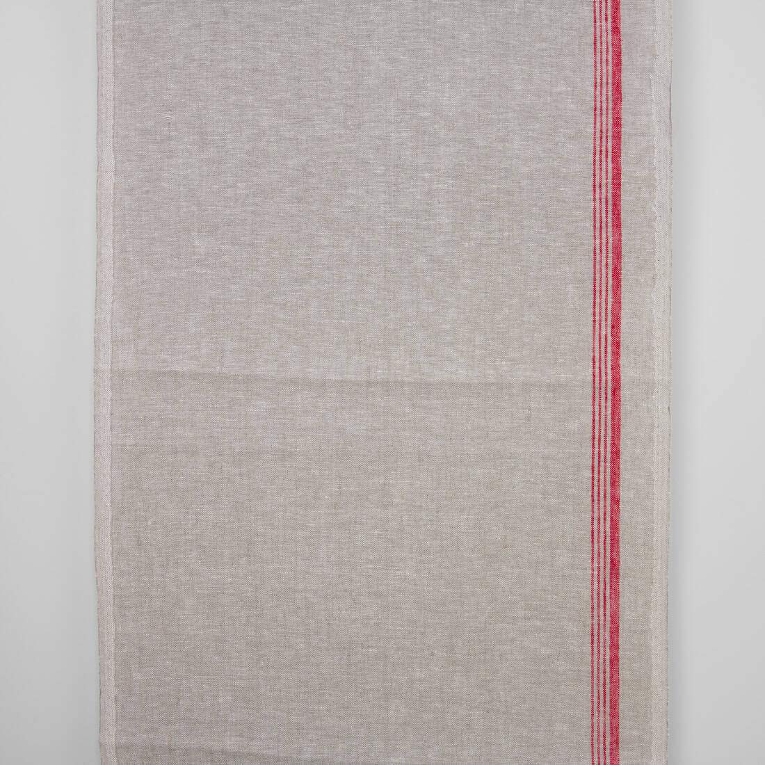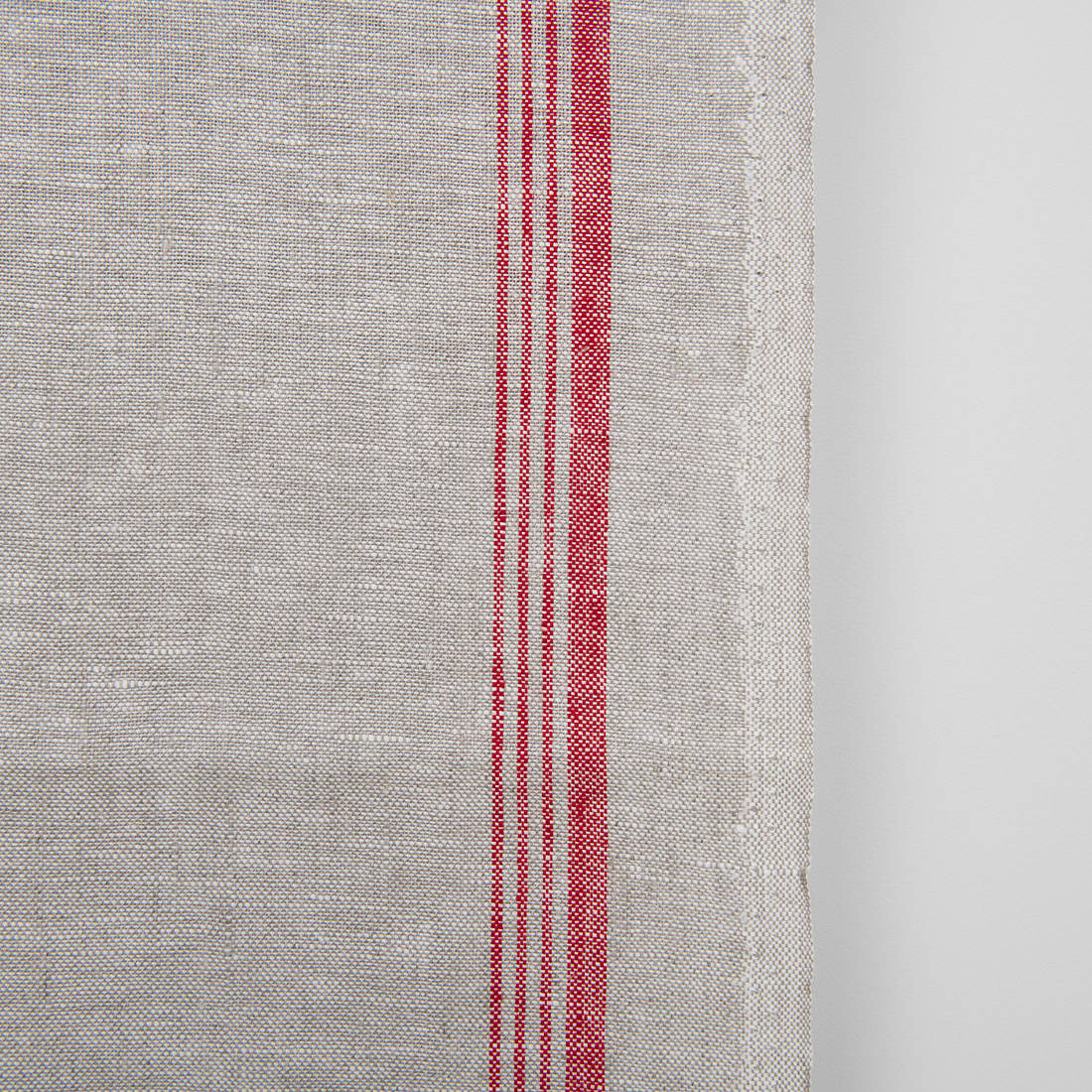 Beige Küchentücherstoff mit roten Streifen ist aus 100% Leinen hergestellt worden. Für den Grund haben wir naturgraues und milchweißes Garn verwendet. Robust, dicht gewebt, reißfest, dick. Die Qualität und die Breite (50cm) dieses Leinenstoffs ist ideal für Küchentücher.