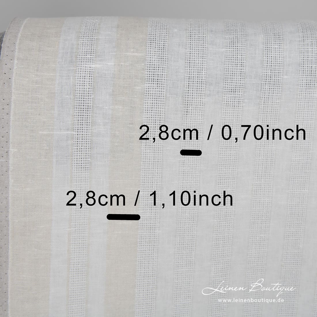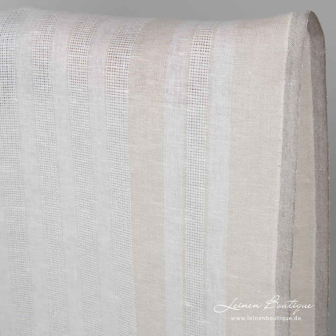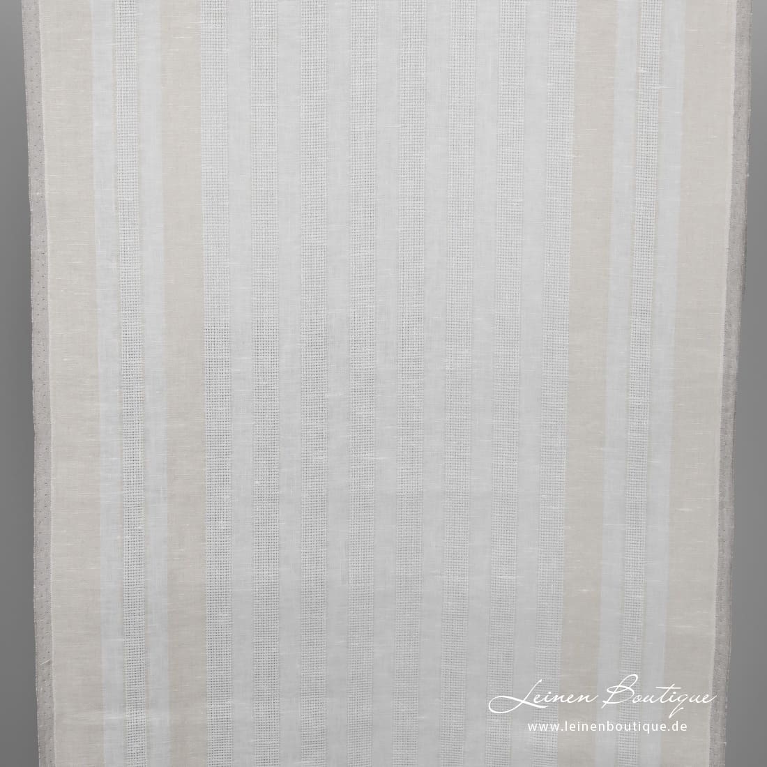 Der Leinen-Küchentücherstoff ist in vertikalen dichten und Ajour-Streifen aus milchweißem (gelblichweißem) und naturgrauem (ungefärbtem, bräunlichgrauem) Garn gewebt. Das Reinleinen ist reißfest, mitteldick, saugstark: ideal zum Nähen von Geschirr- und Küchentüchern.