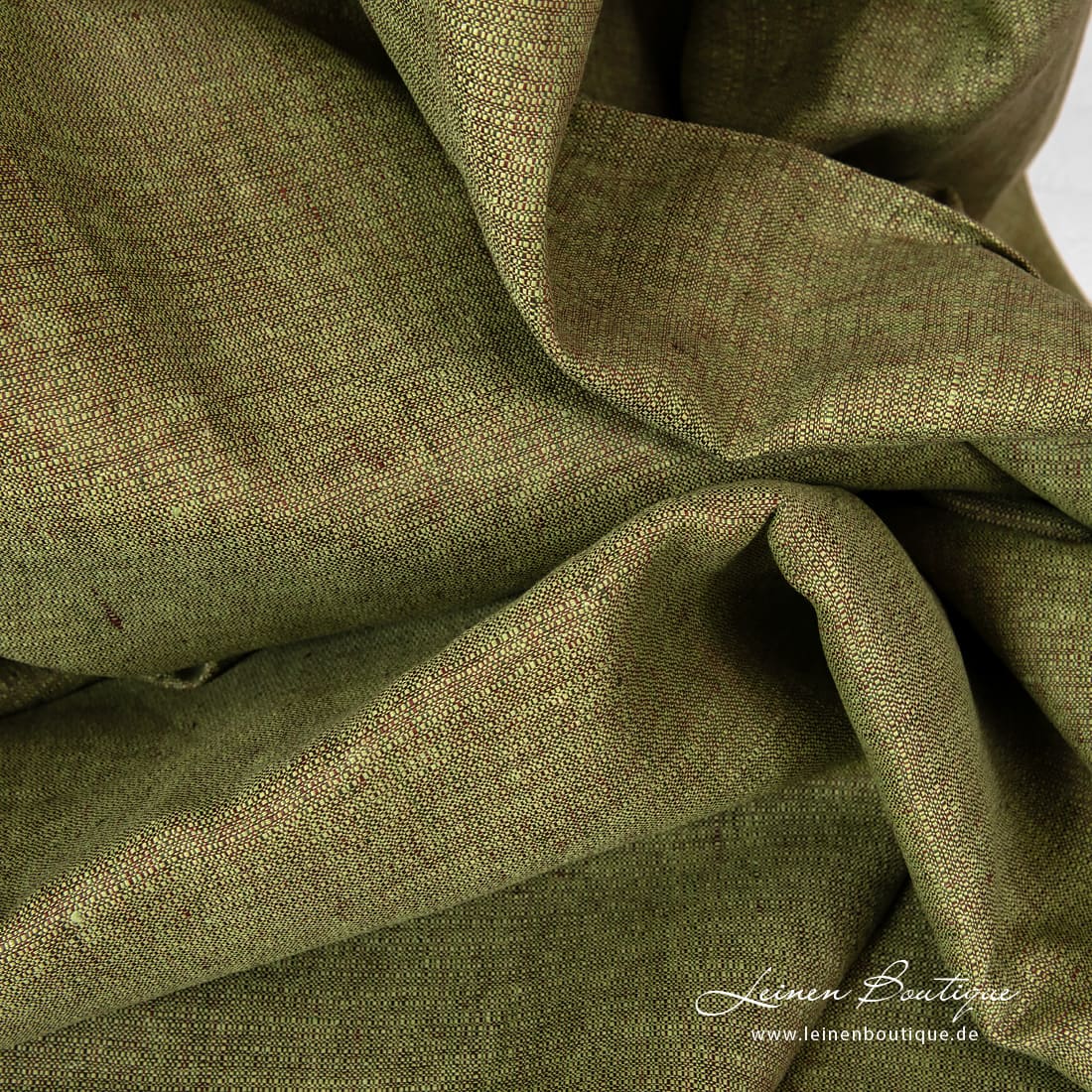 Leinenstoff braun-grün meliert: in dem Stoff haben wir hell-, dunkelgrünes (moosgrünes) und braunes Garn zusammengewebt. Der Stoff ist reißfest, dicht, mitteldick. Er passt zum Nähen von dekorativen Interieurdetails (Gardinen, Sofakissenhüllen, Tischdecken) und Bekleidung.