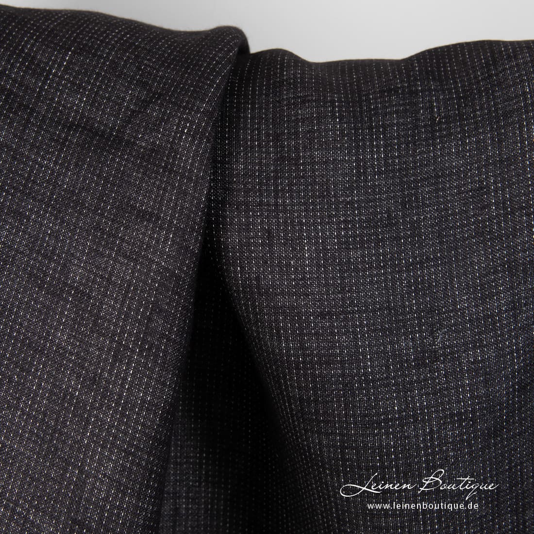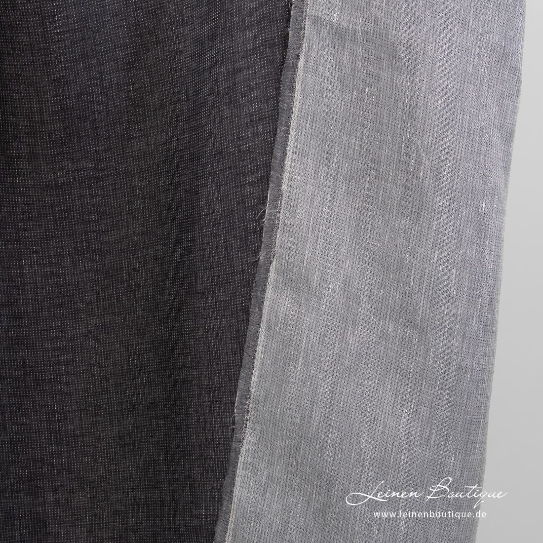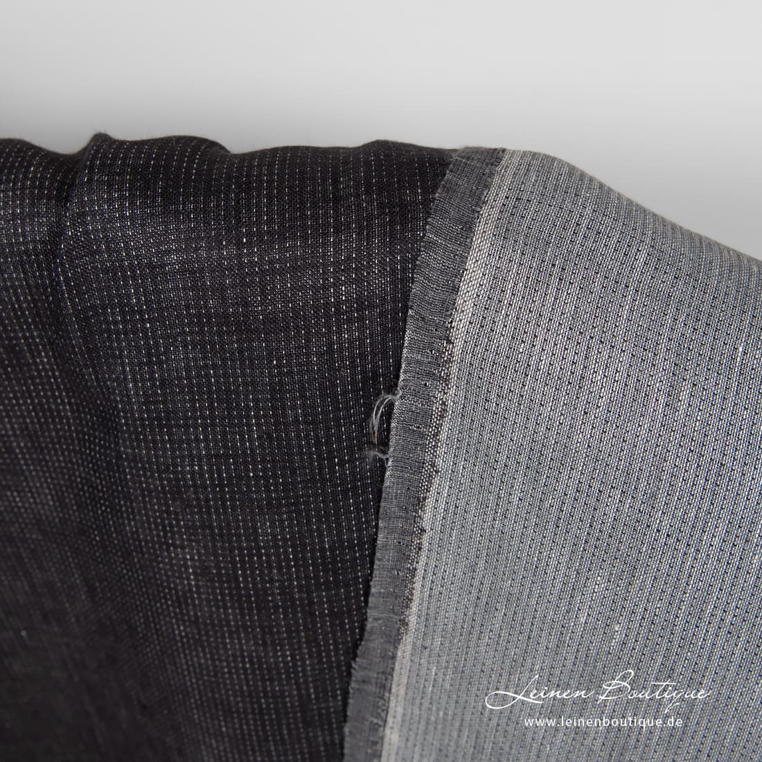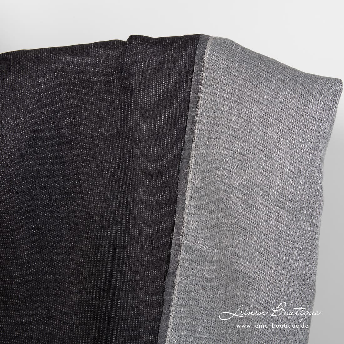 Leinenstoff doppelseitig grauschwarz gepunktet: auf einer Seite sind graue Punkte auf dem schwarzen Grund, andere Seite ist grau, schwarz gepunktet. In Ihrem Artikel können Sie beide Seiten des Stoffes zueinender kombinieren. Reißfest, dicht, mitteldick, doppelschichtig, für Bekleidung, Heimtextilien passend.