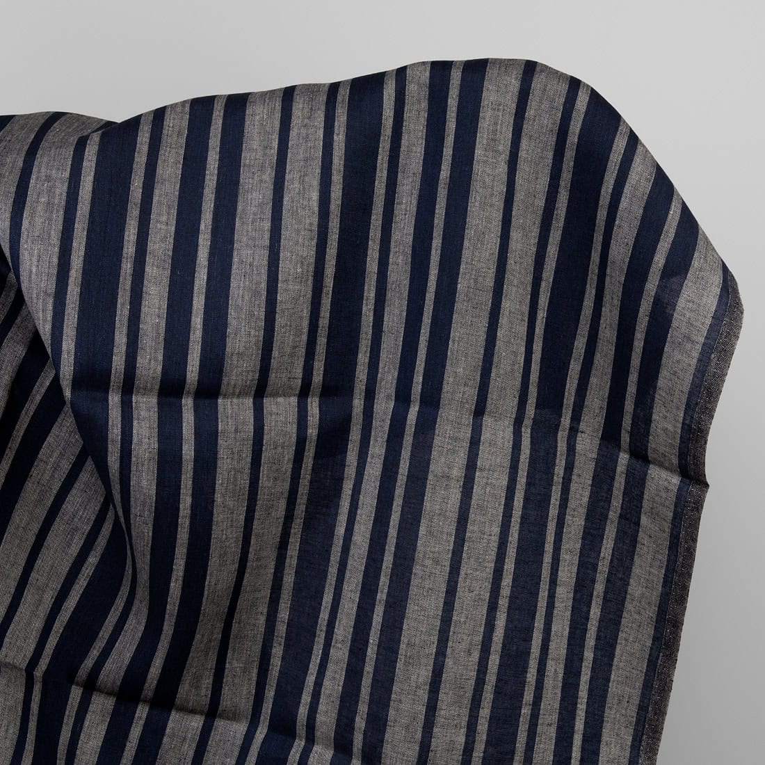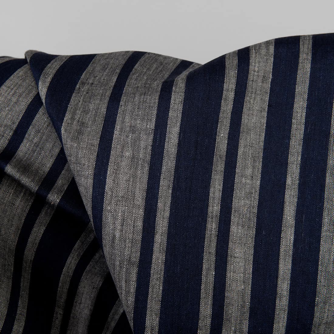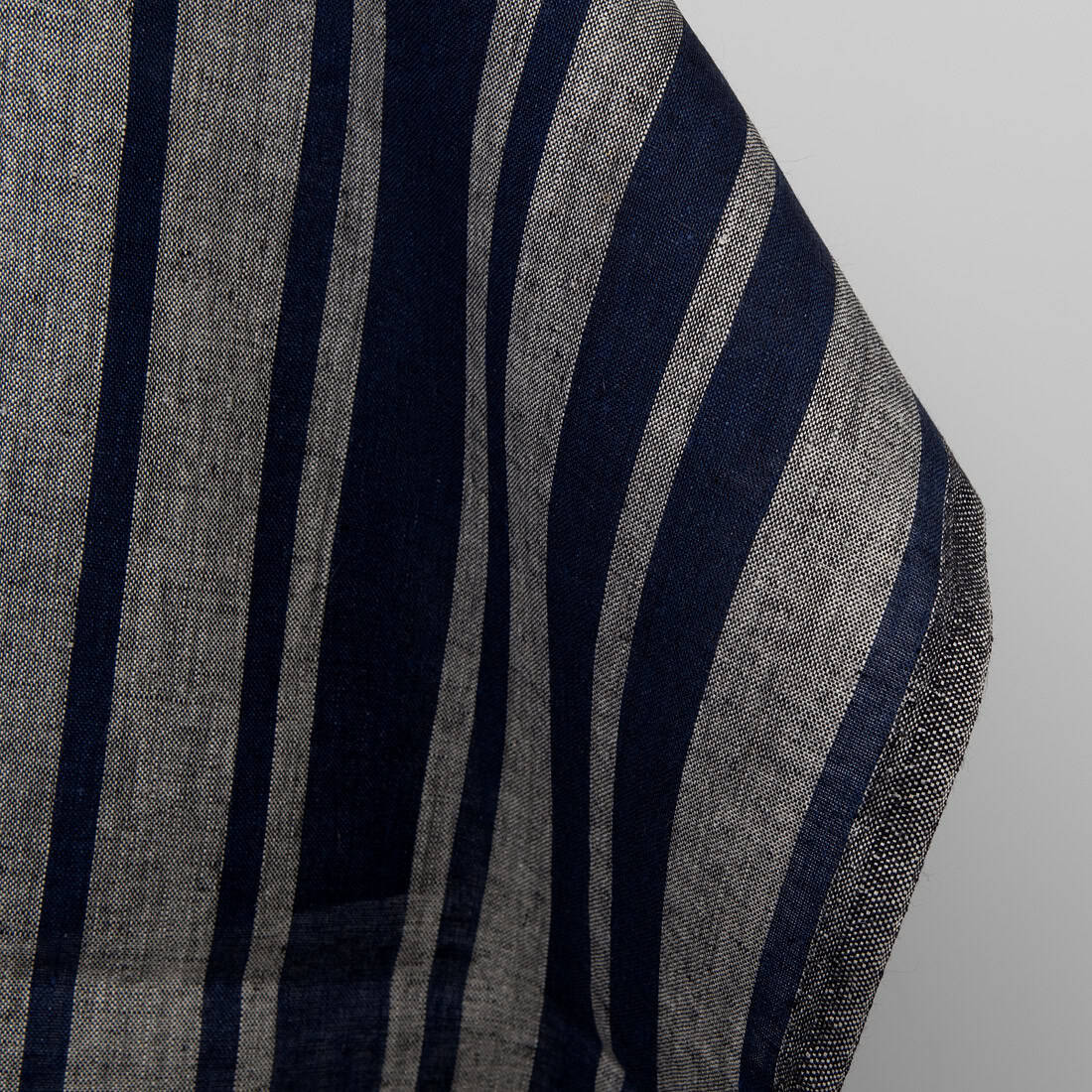Leinenstoff, in vertikalen Streifen von verschiedener Breite gewebt. Streifen sind dunkelblau, für andere wurde naturgraues (ungefärbtes, bräunlichgraues) und schwarzes Leinengarn zusammengewebt. Dieser mitteldicke, dichte Leinenstoff passt zum Nähen von vielen Textilien.