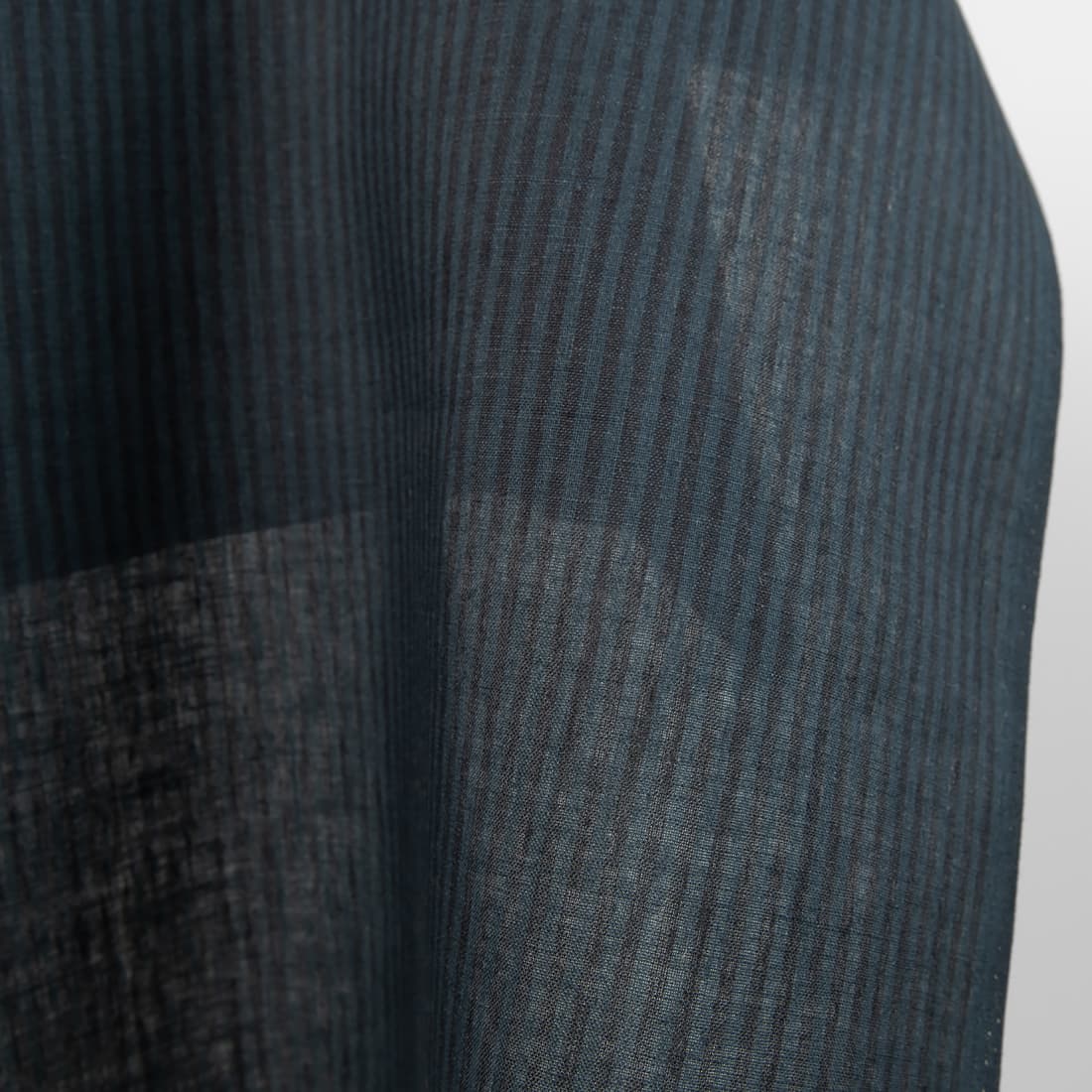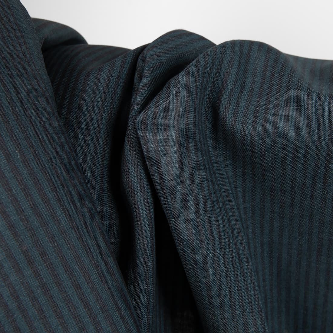 Reinleinen, in schmalen vertikalen dunkelblauen und schwarzen Streifen gewebt. Das Leinen ist reißfest, dicht, mitteldick.