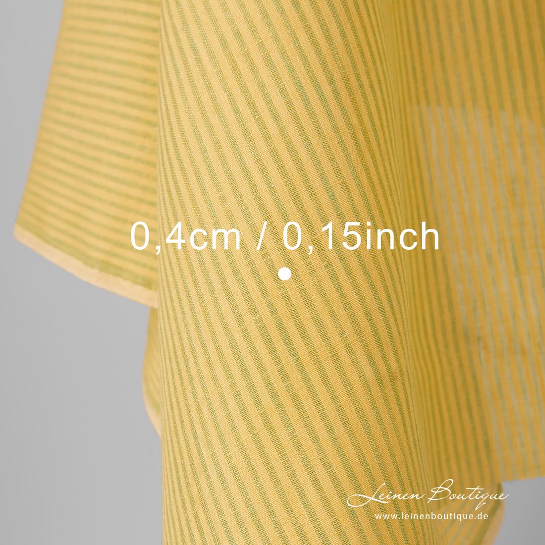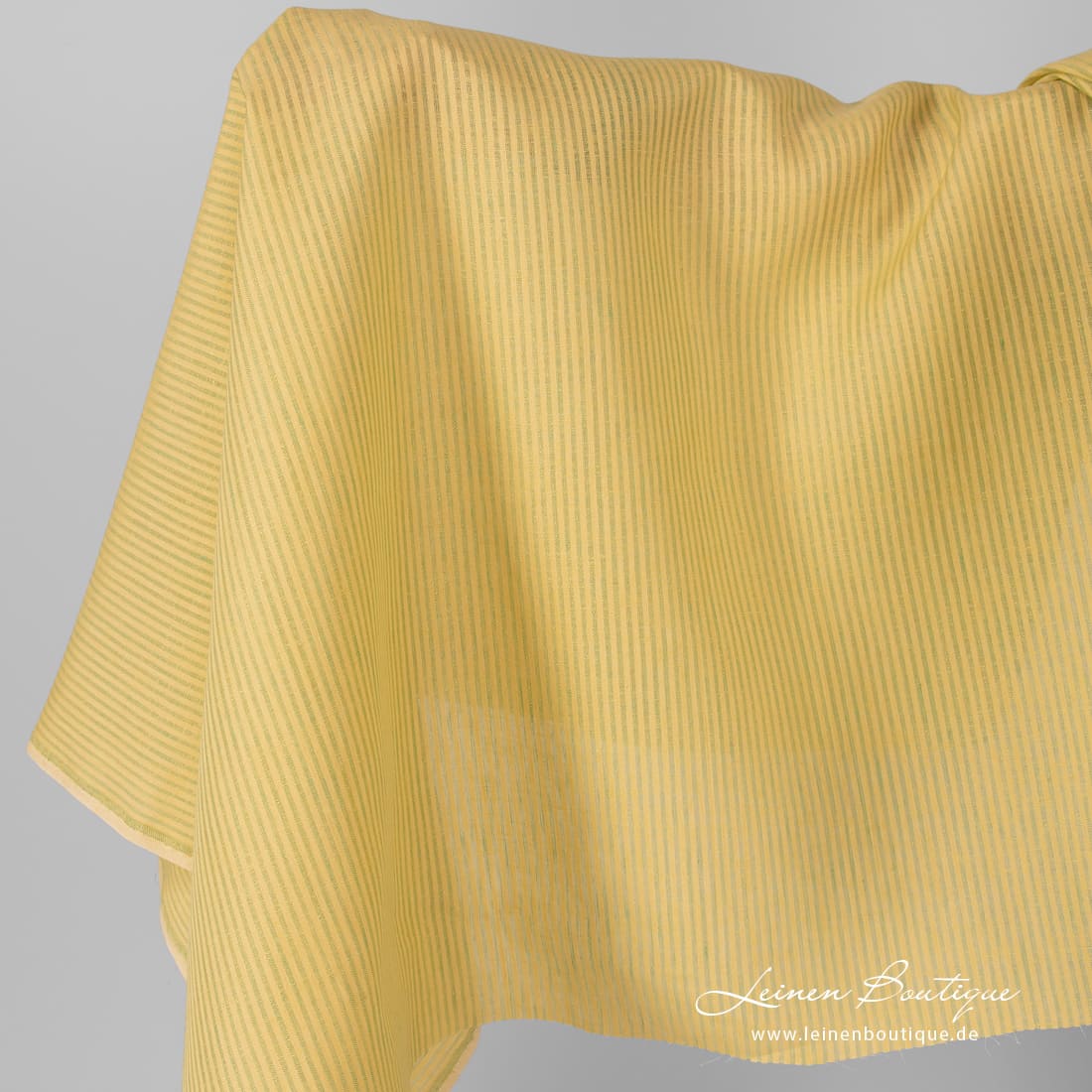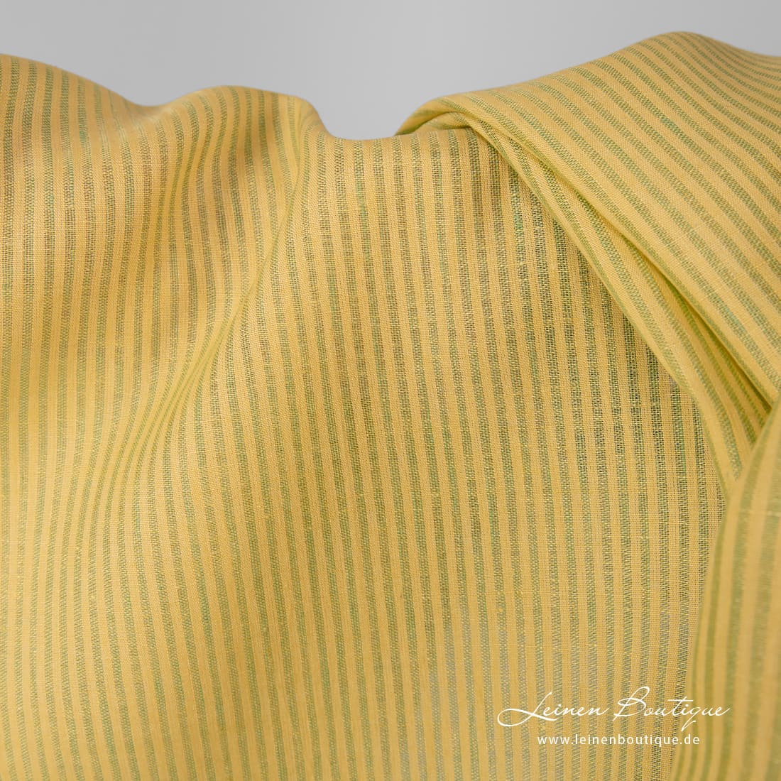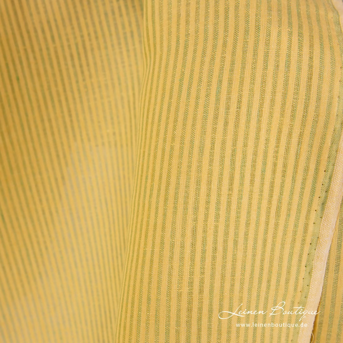 Leinenstoff gelb-hellgrün gestreift. Die gelben Streifen in dem Stoff sind dicht, die grünen offen gewebt, transparent. Aus dem Reinleinen kann man Bekleidung, Tischdecken, Servietten, Gardinen anfertigen.