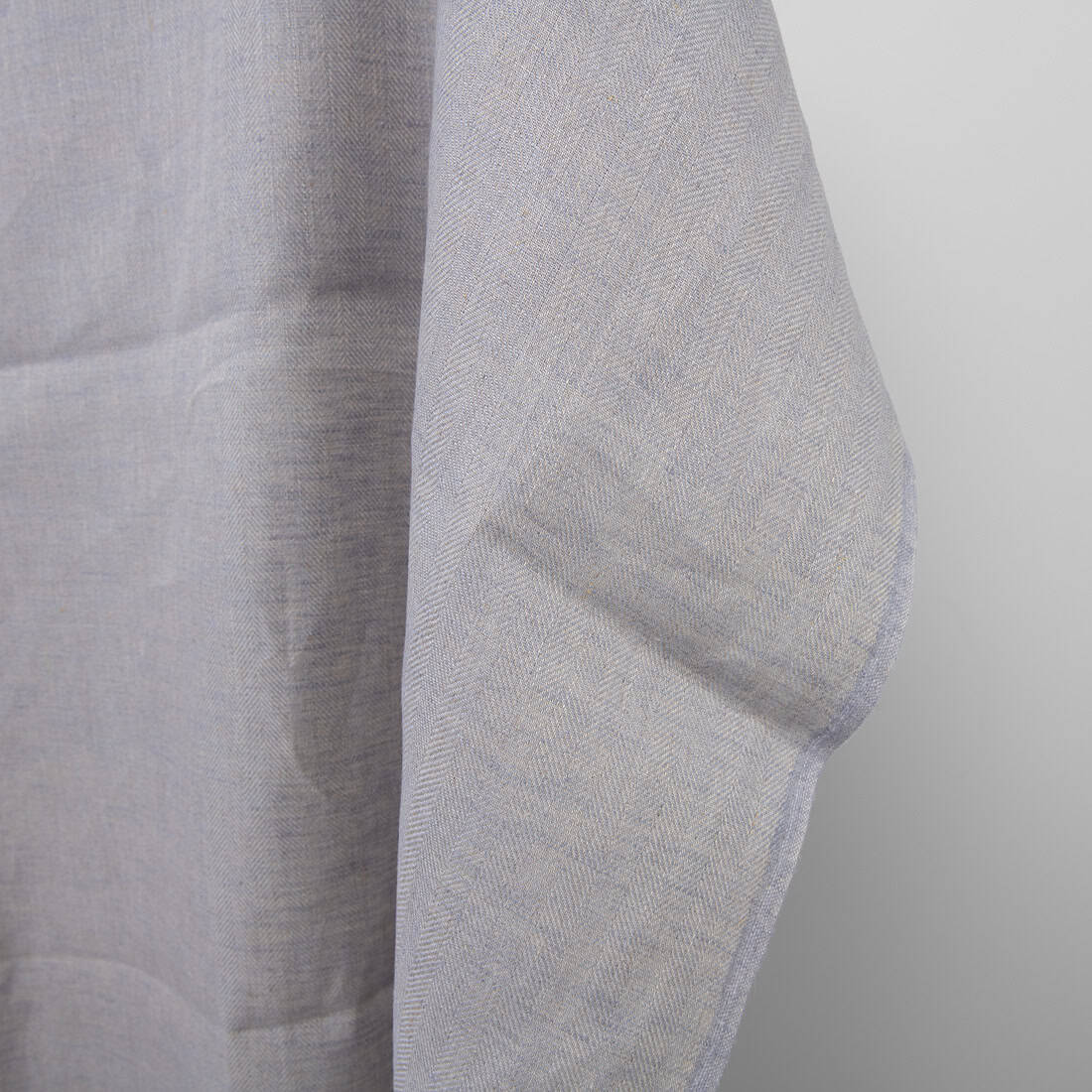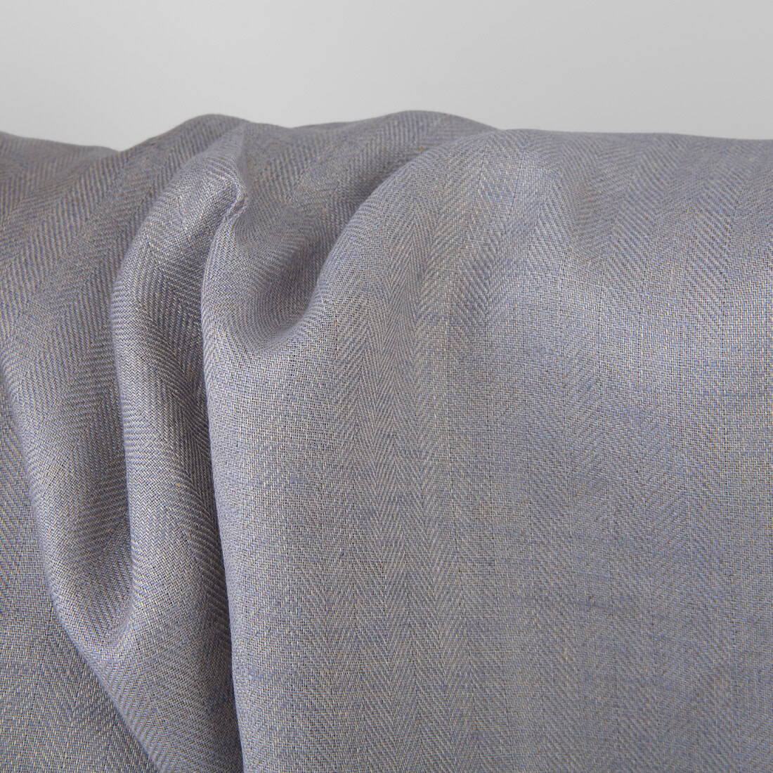 Leinenstoff in Hellgrau (mit leichtem fliederfarbigem Ton) ist in Fischgratbindung aus naturgrauem (ungefärbtem, bräunlichgrauem) und lilagrauem Garn gewebt. Dieser mittelschwere, ziemlich dicht gewebte Stoff ist für Tisch- und Bettwäsche, auch für Kleider verschiedener Art, Bekleidungszubehör passend.