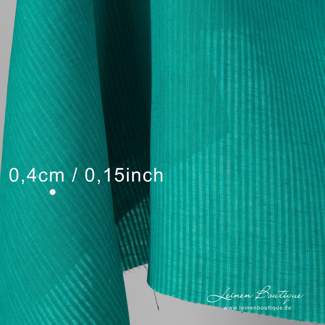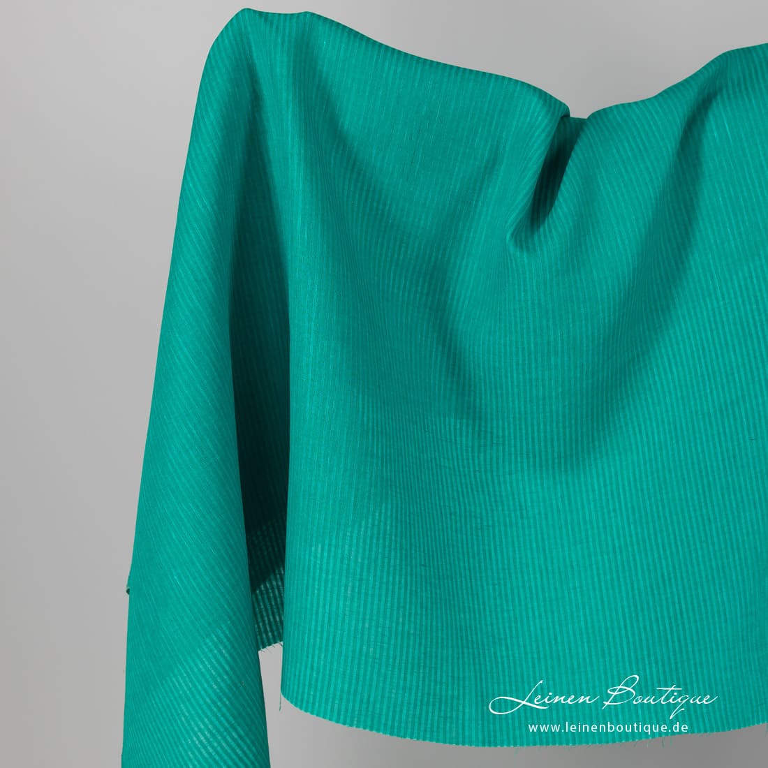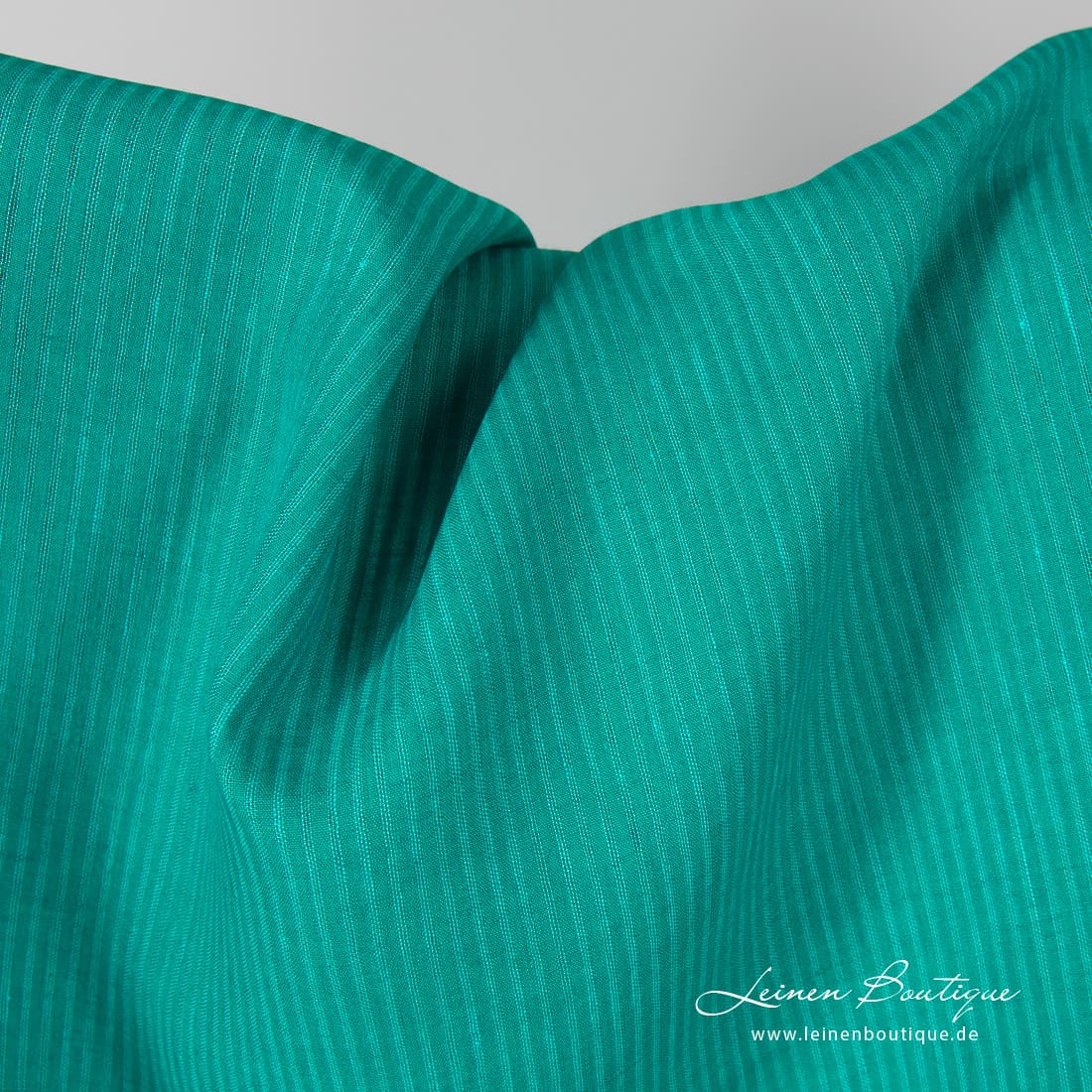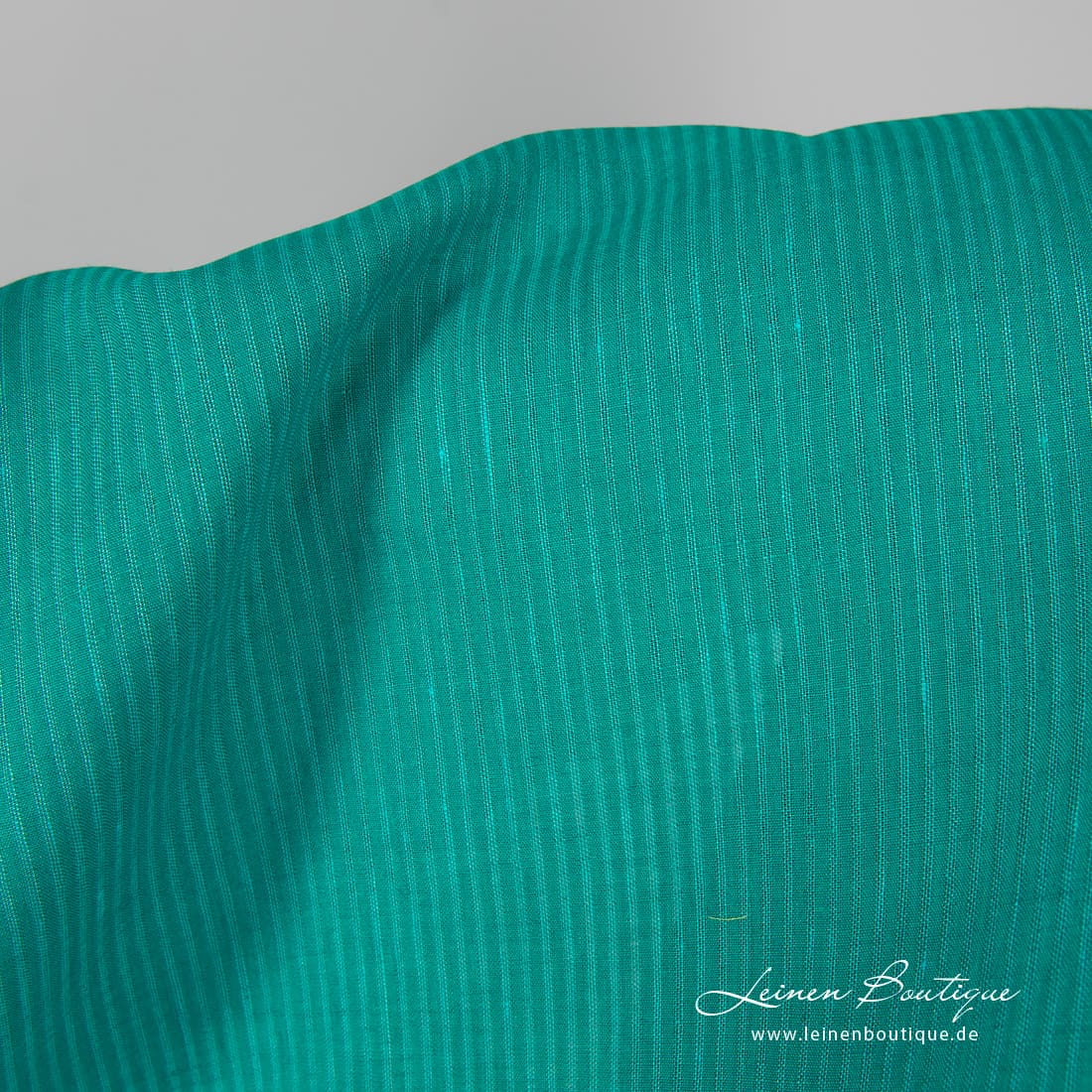 Leinenstoff grün-türkis gestreift. Vertikale türkisfarbene Streifen sind in offener Bindung (teilweise transparent) eingewebt. Das Reinleinen ist reißfest, mitteldick, zum Nähen von Bekleidung, Heimtextilien geeignet.