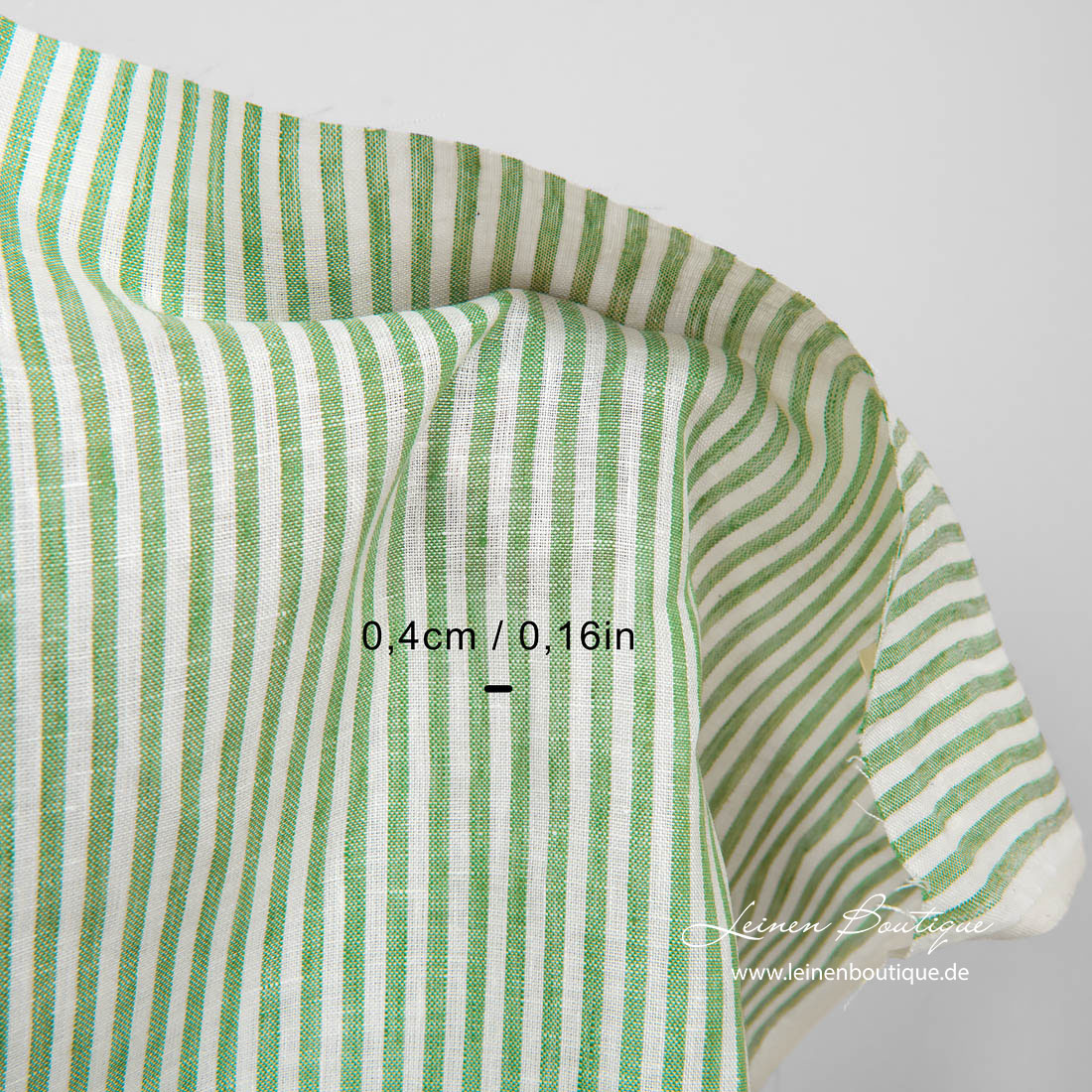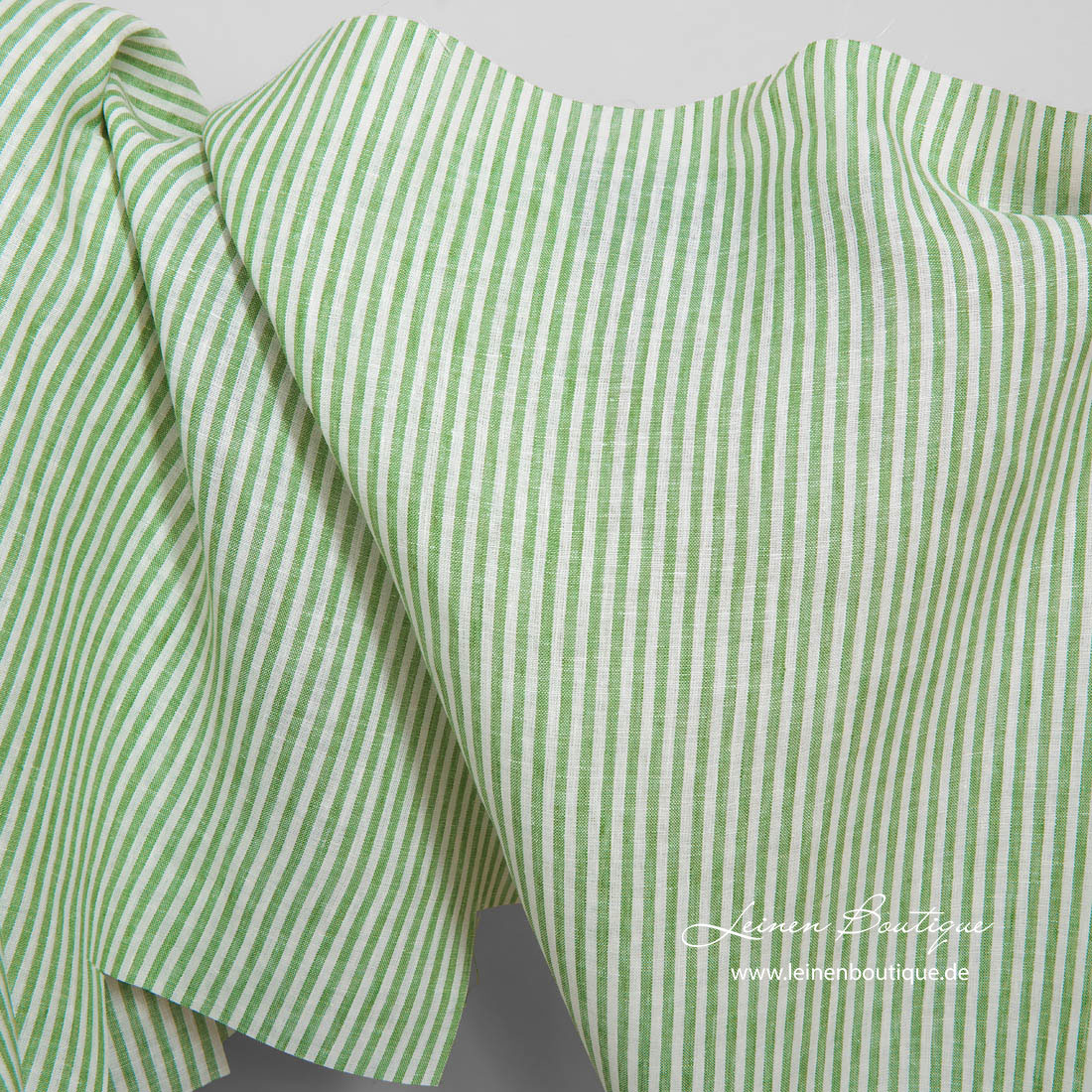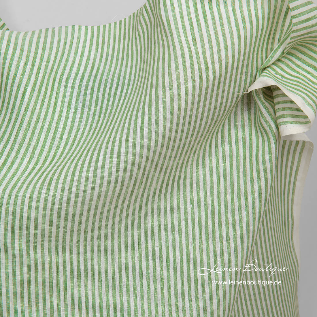Leinenstoff hellgrün gestreift. Schmale hellgrüne und milchweiße (gelblichweiße) Streifen gehen in dem Stoff vertikal. Das Reinleinen ist mitteldick, mittelschwer, dicht, reißfest.