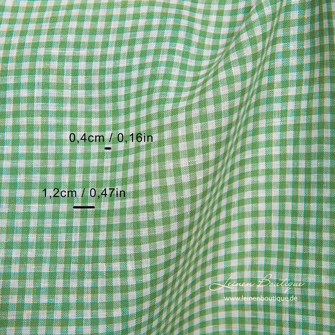 Leinenstoff hellgrün kariert. Das Reinleinen mit kleinen Karos in Hellgrün und Milchweiß (Gelblichweiß) ist mitteldick, mittelschwer, dicht gewebt und reißfest.