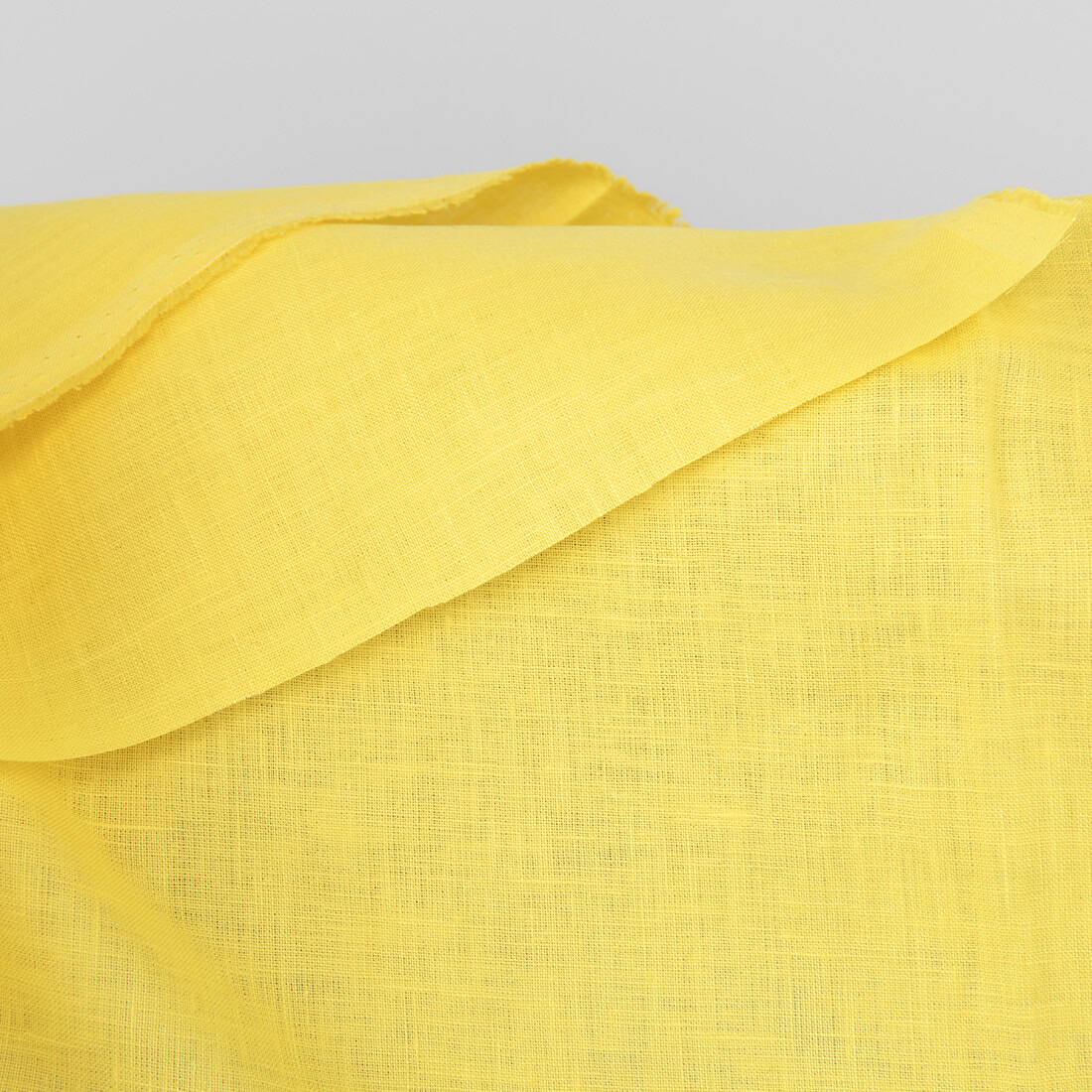 Gelbes Reinleinen in Leinwandbindung. Dicht gewebt, mitteldick, leicht. Für die Bekleidung und Heimtextilien geeignet.
