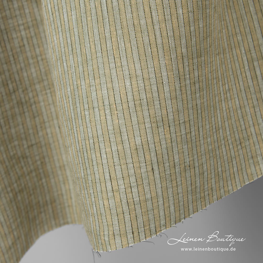 Leinenstoff mit grünlichen, gelblichen Streifen, die im Stoff vertikal gehen. Für das Reinleinen haben wir weißes, dunkelgrünes, blaßgrünes und creme (gelbliches) Garn verwendet. Leichter, reißfester, dichter, mitteldicker Stoff für Bekleidung, Bettwäsche, Gardinen, Tischdecken.