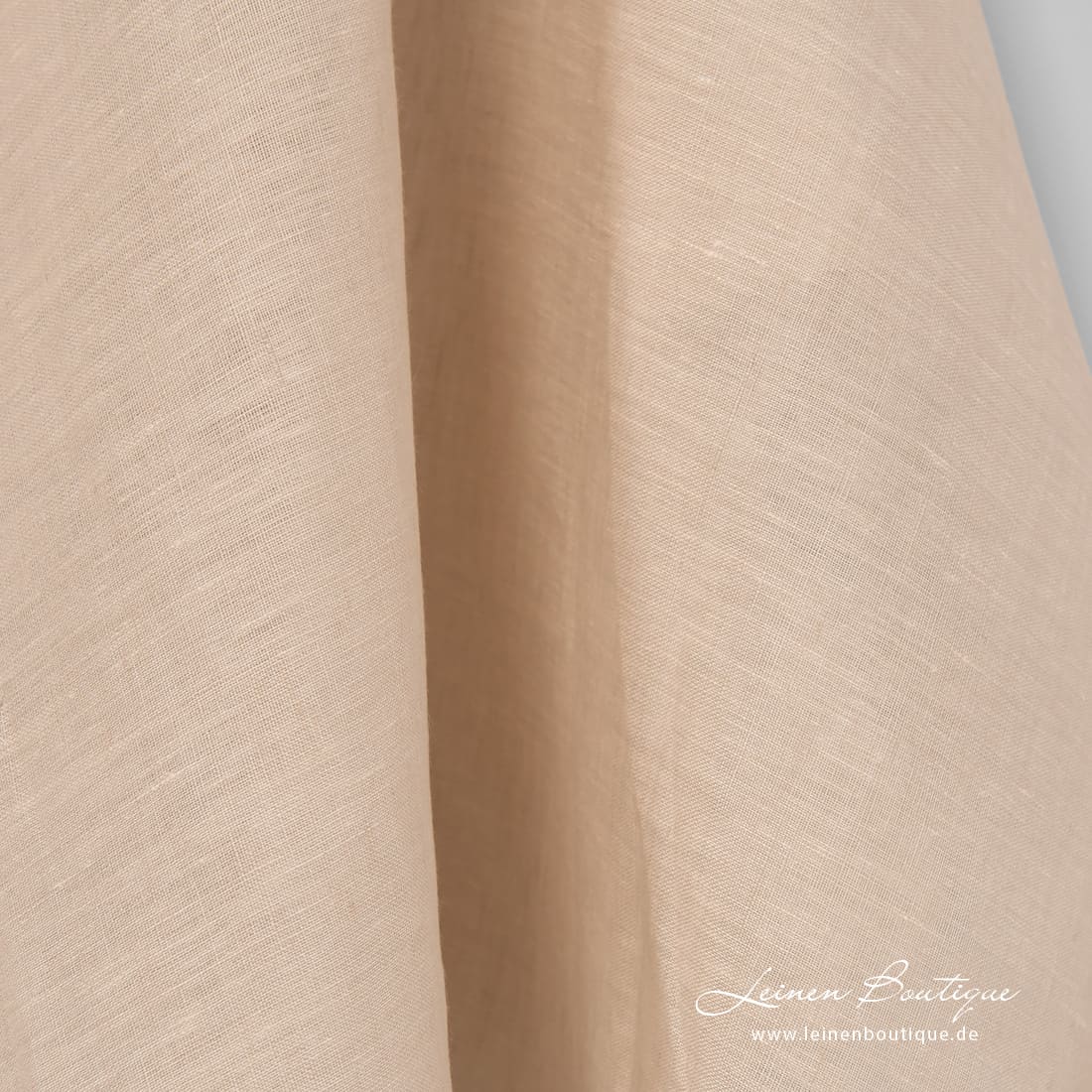 Leinenstoff sandfarbig. In ihm haben wir hellbraunes (taupe) und helles cremefarbenes (gelbliches) Garn zusammengewebt. Das Reinleinen ist leicht, reißfest, dicht.