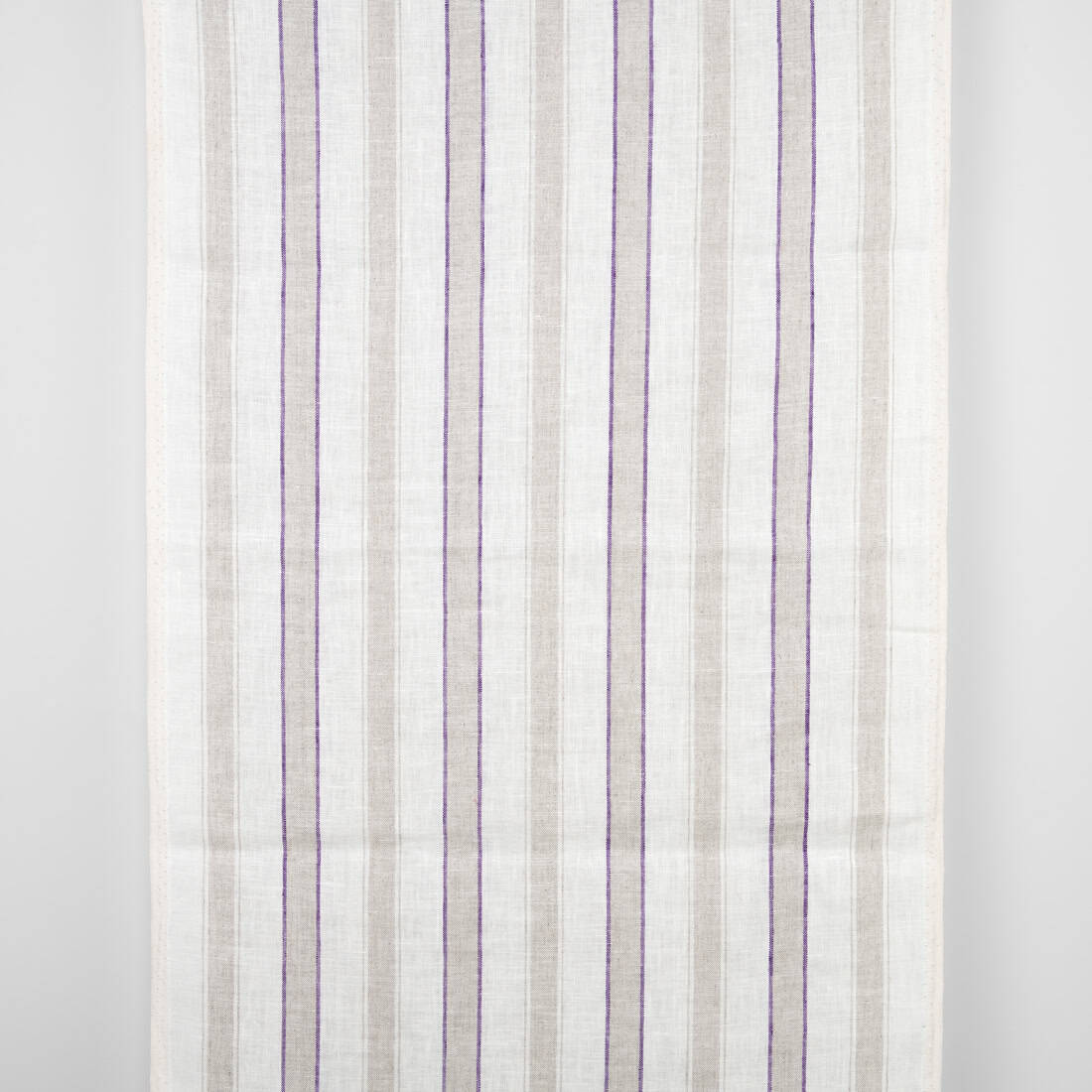 Milchweißer (gelblich weißer) 100% Leinenstoff mit hellgrauen und kräftig violetten vertikalen Streifen. Schmal, mitteldicht, dicht gewebt.