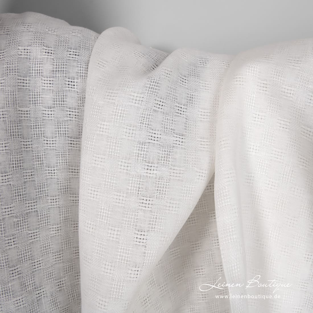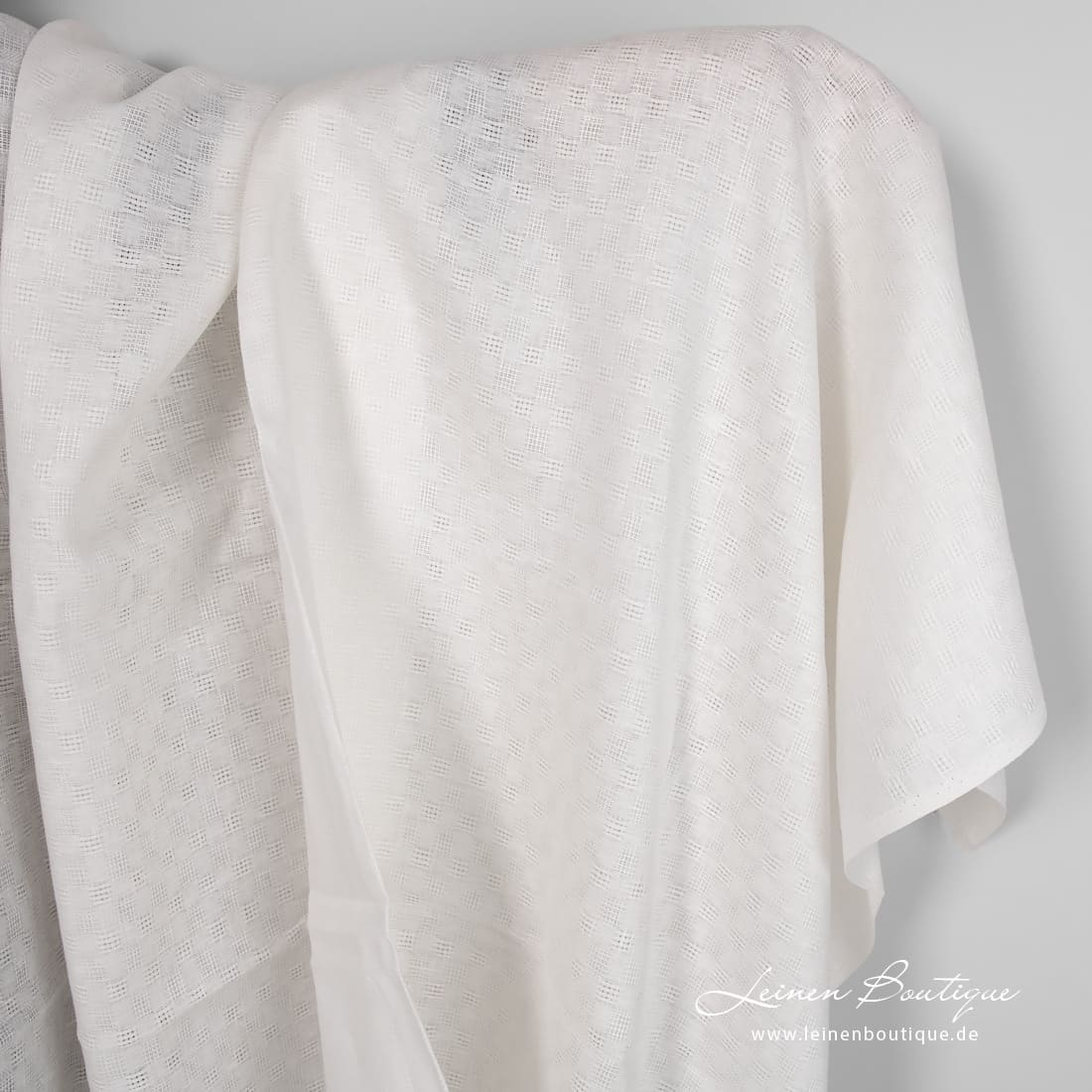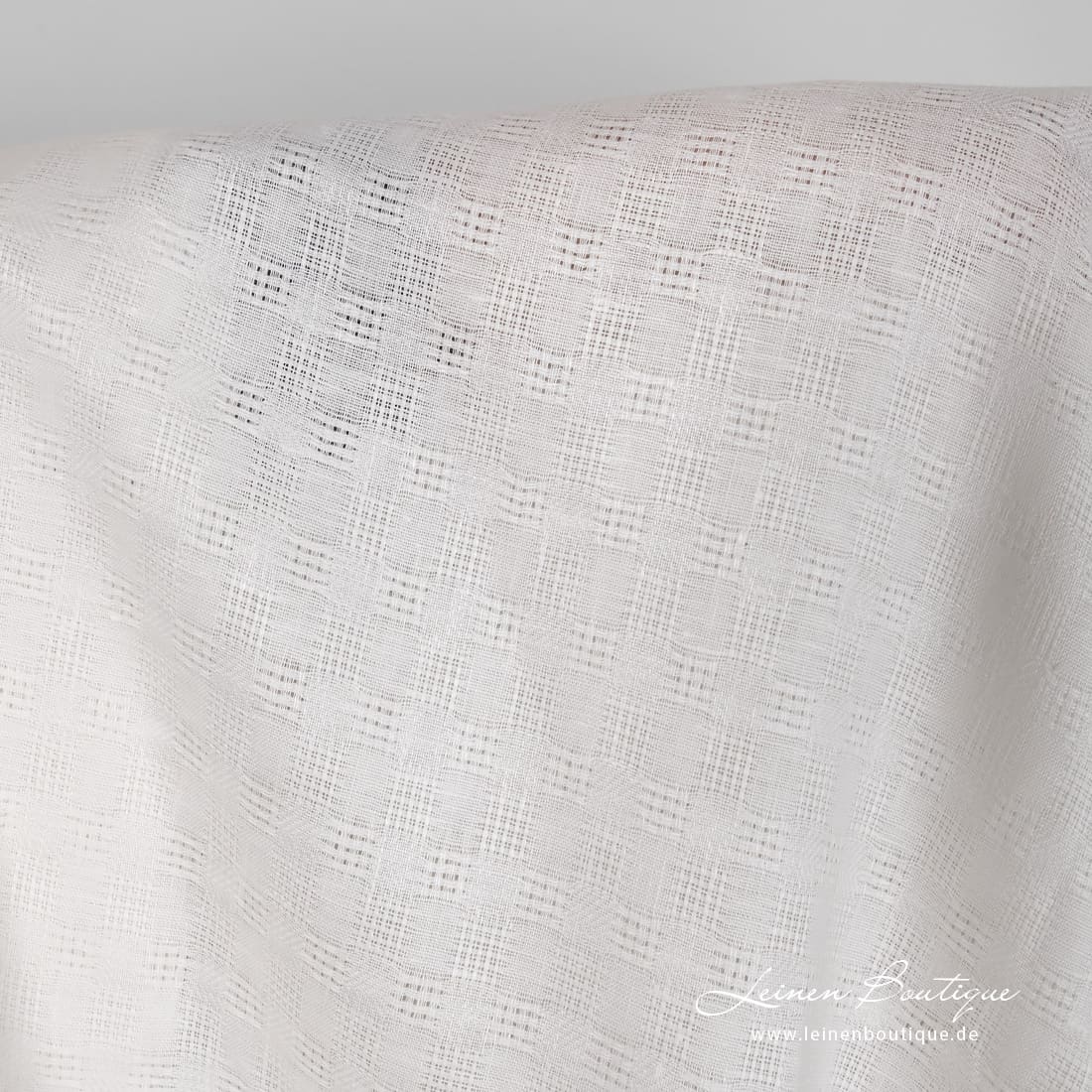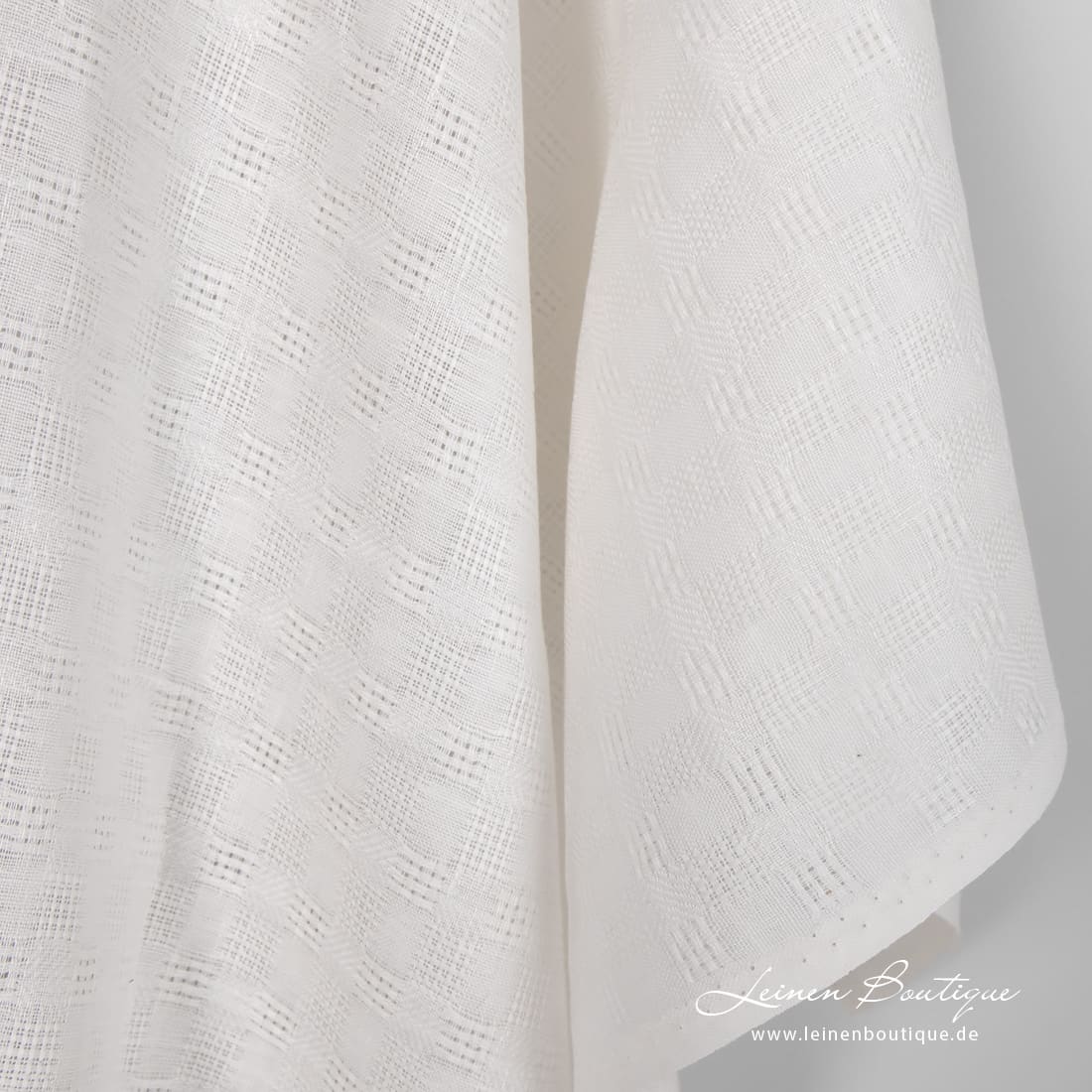 Milchweißer (gelblichweißer) Leinenstoff mit dichten und Ajour-Karos ist reißfest, mitteldick, zum Nähen von dekorativen Tischdecken, Servietten, Gardinen, Bettwäsche und Bekleidung geeignet.