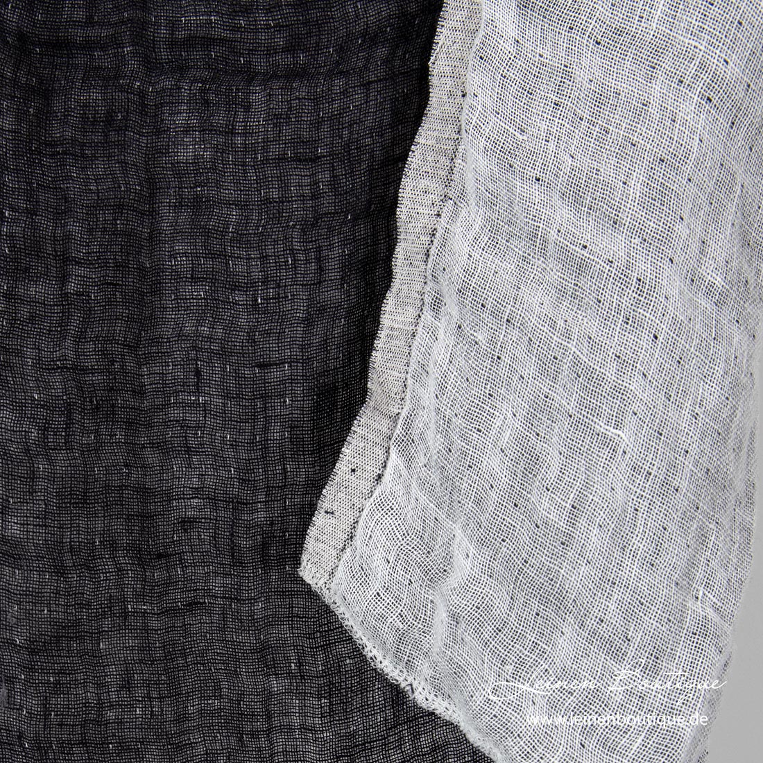 Doppelseitiger Leinenstoff weiß / schwarz, vorgewaschen. Der Stoff ist auch zweischichtig. Eine Seite ist milchweiß (gelblichweiß) mit kleinen schwarzen Punkten, andere Seite schwarz, weiß gepunktet. Reißfest, dicht gewebt, mitteldick. Spezielles Waschen hat dem Leinen die Weichheit und Geschmeidigkeit gegeben.
