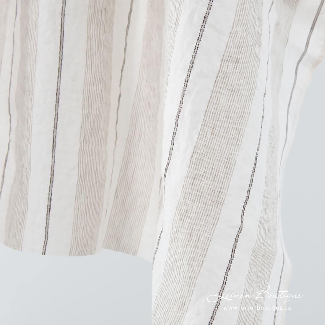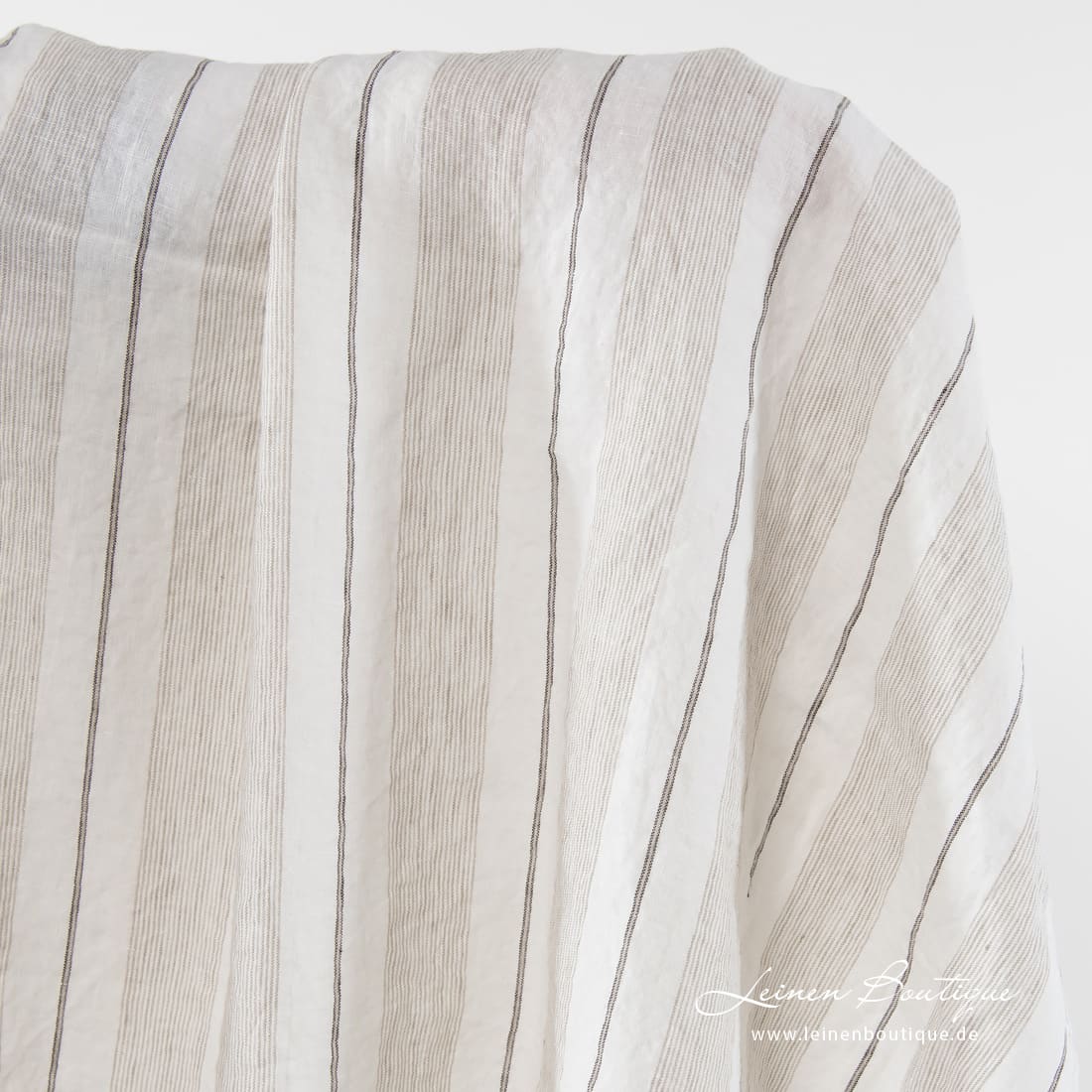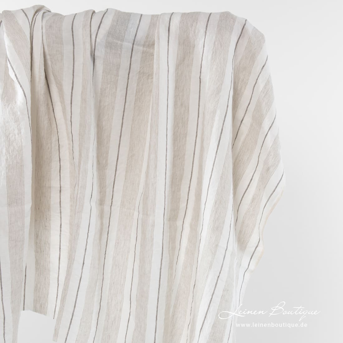 Milchweißer (gelblichweißer) Leinenstoff mit vertikalen beigen, braunen Streifen ist leicht, reißfest, dicht, mitteldick. Mit spezieller Technologie gewaschenen, damit weich, geschmeidig ist, nicht mehr beim Waschen einläuft.