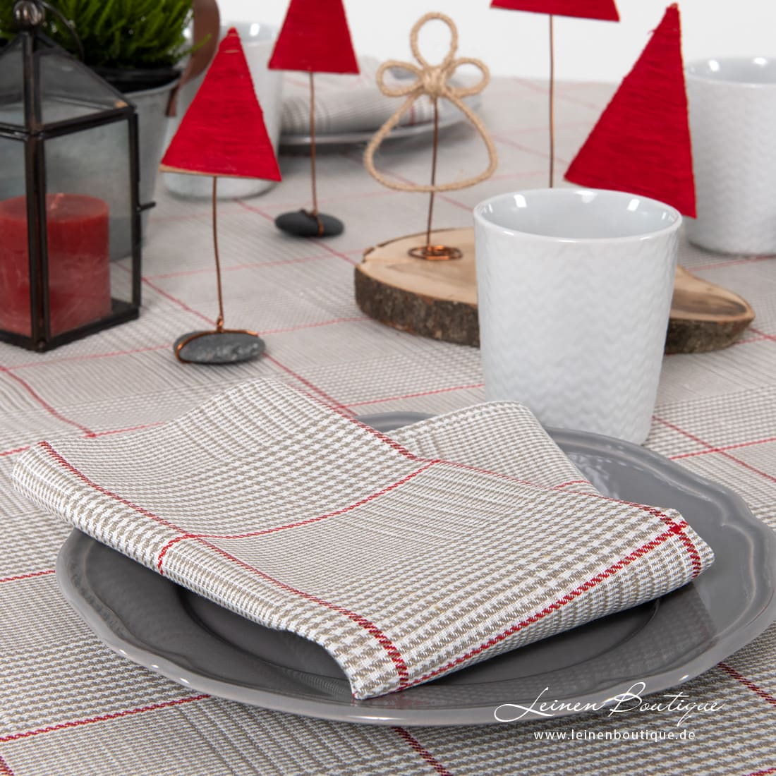 Halbleinen-Serviette mit bräunlichgrauen, milchweißen (gelblichweißen), kleinen Karos und schmalen Streifen in Rot. Buntes Webmuster des Artikelstoffes schafft besondere Lebendigkeit, Schimmern. In der Kombination mit der Tischdecke aus demselben Stoff - Blicke auf sich lenkende Tischdekoration!