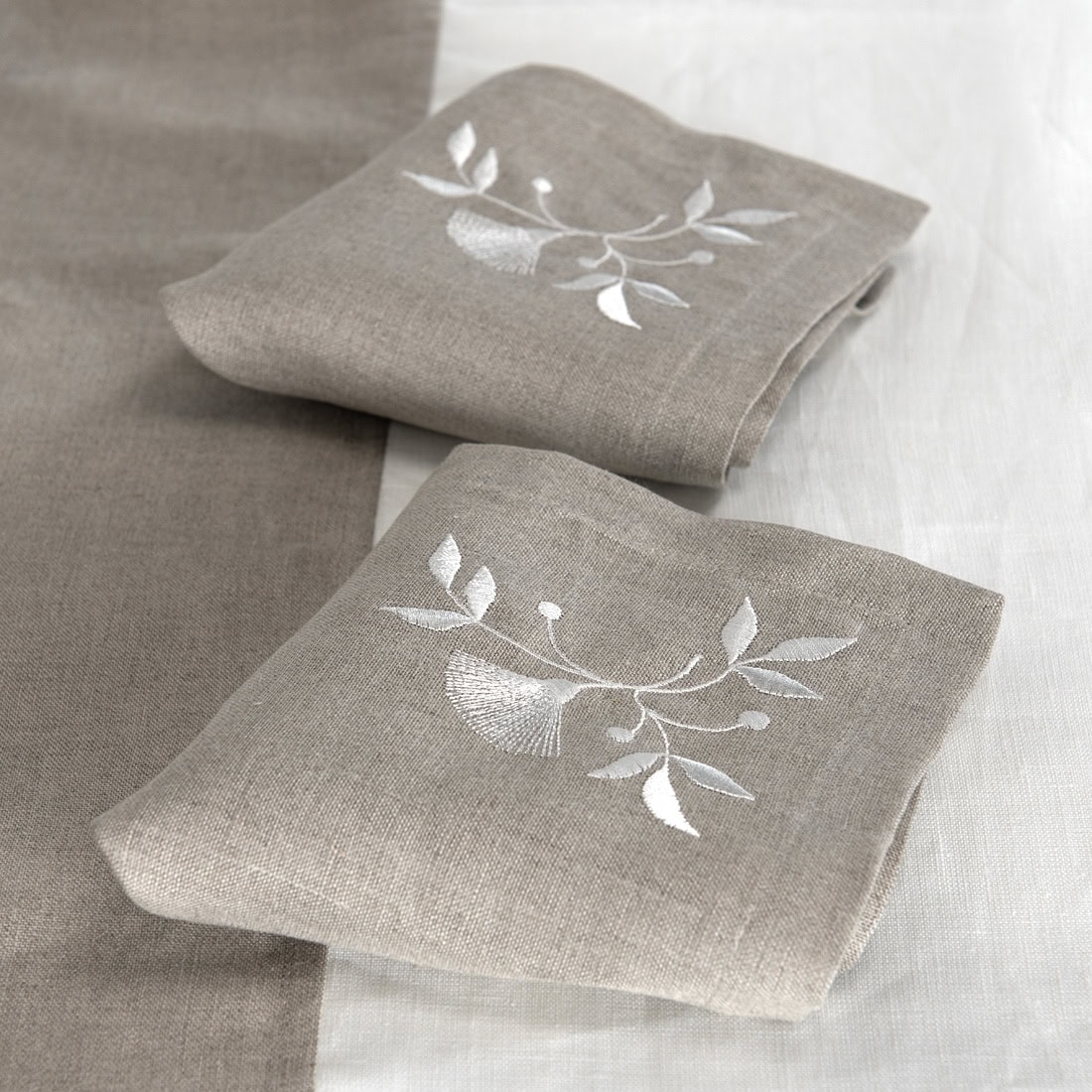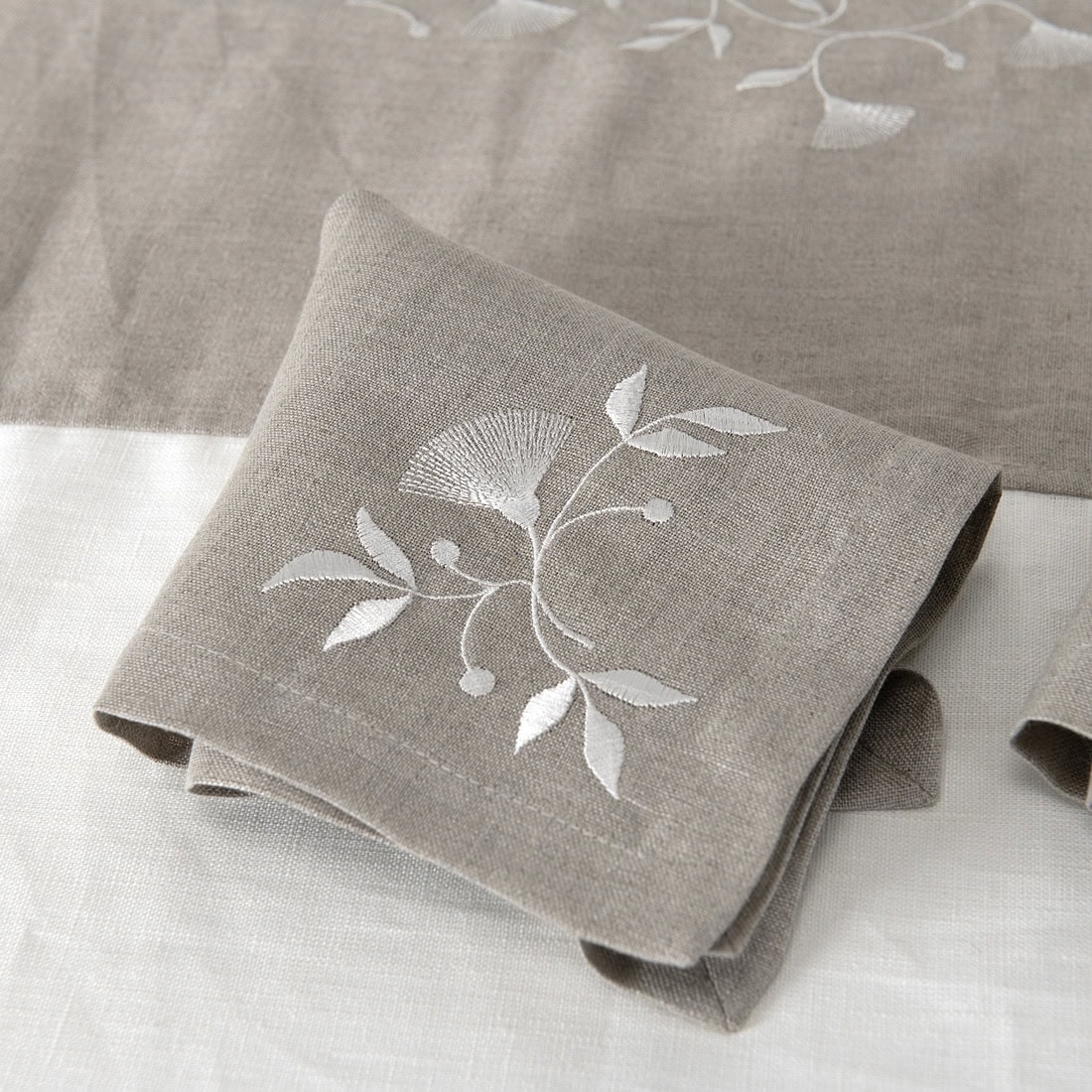 - Details: in einer Ecke weiße Blume mit Blätterchen bestickt