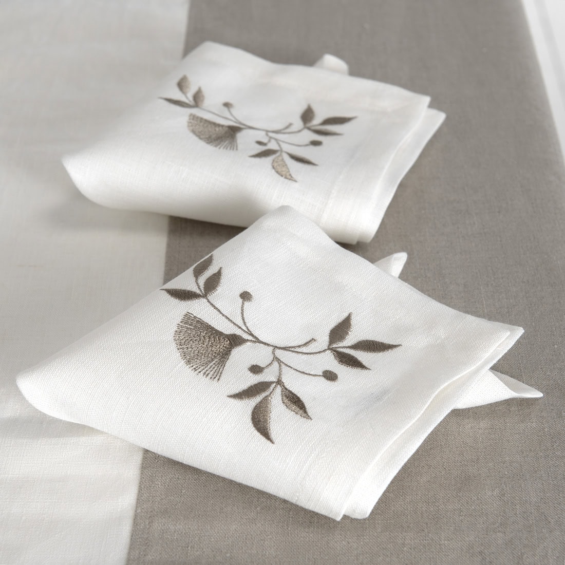 - Details: in einer Ecke beige Blume mit Blätterchen bestickt