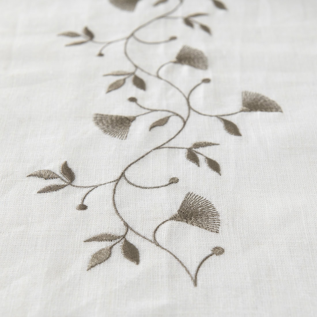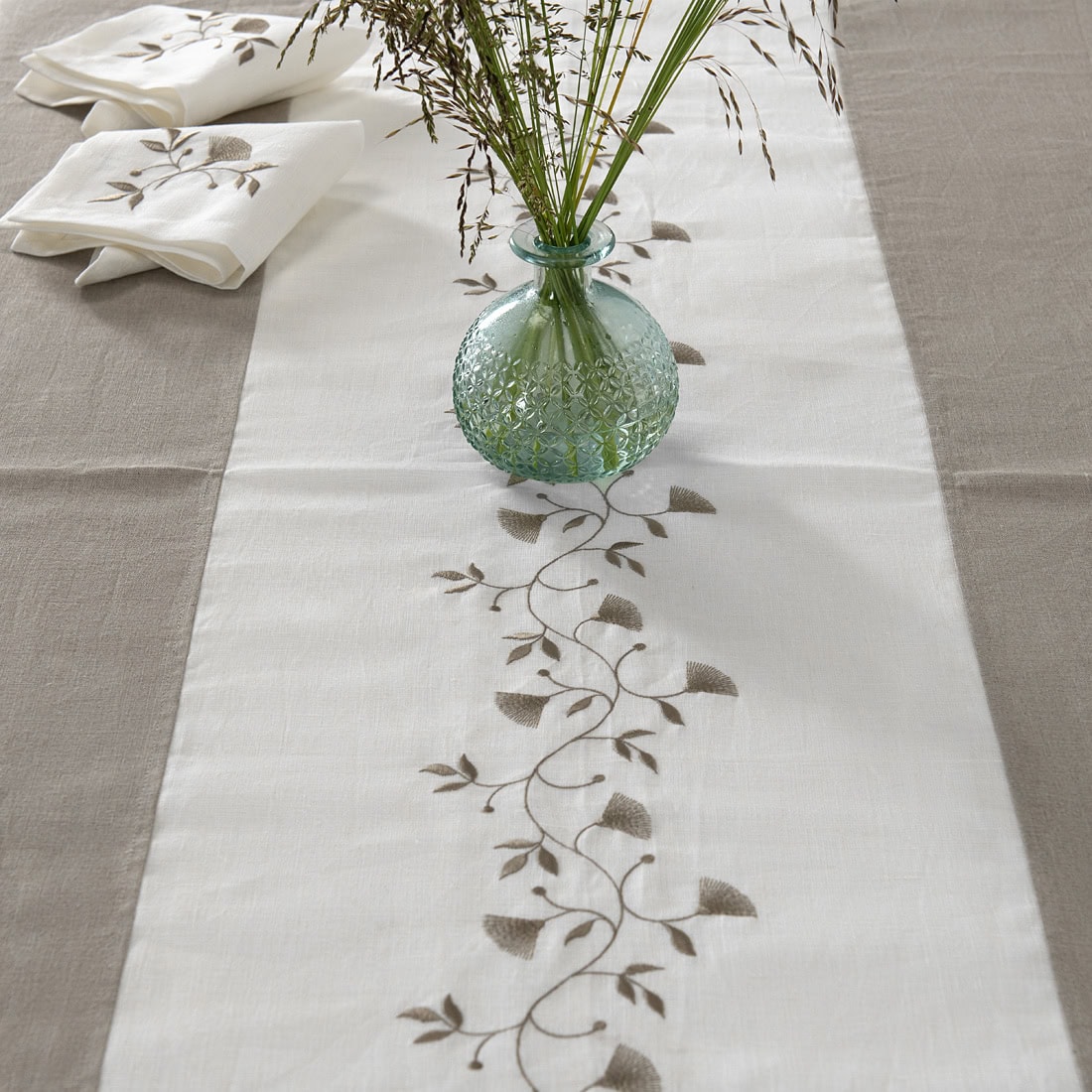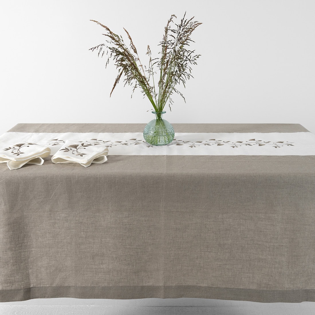 • ORSON naturgraue Leinentischdecke mit milchweißer Mitte mit beigen bestickten Blumen