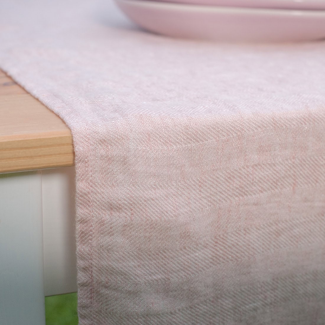 Der Stoff des rötlichen Tischläufers ist aus hellrosa und weißem Leinengarn gewebt worden. Die Fischgratbindung „belebt“ den Artikel, die Weichheit des vorgewaschenen Stoffes lädt zur Kaffeetasse ein. Genießen Sie die Augenblicke, vergessen alle Sorgen. Auch das Bügeln! Die knittrige Struktur ist spezifisch für den Tischläufer.