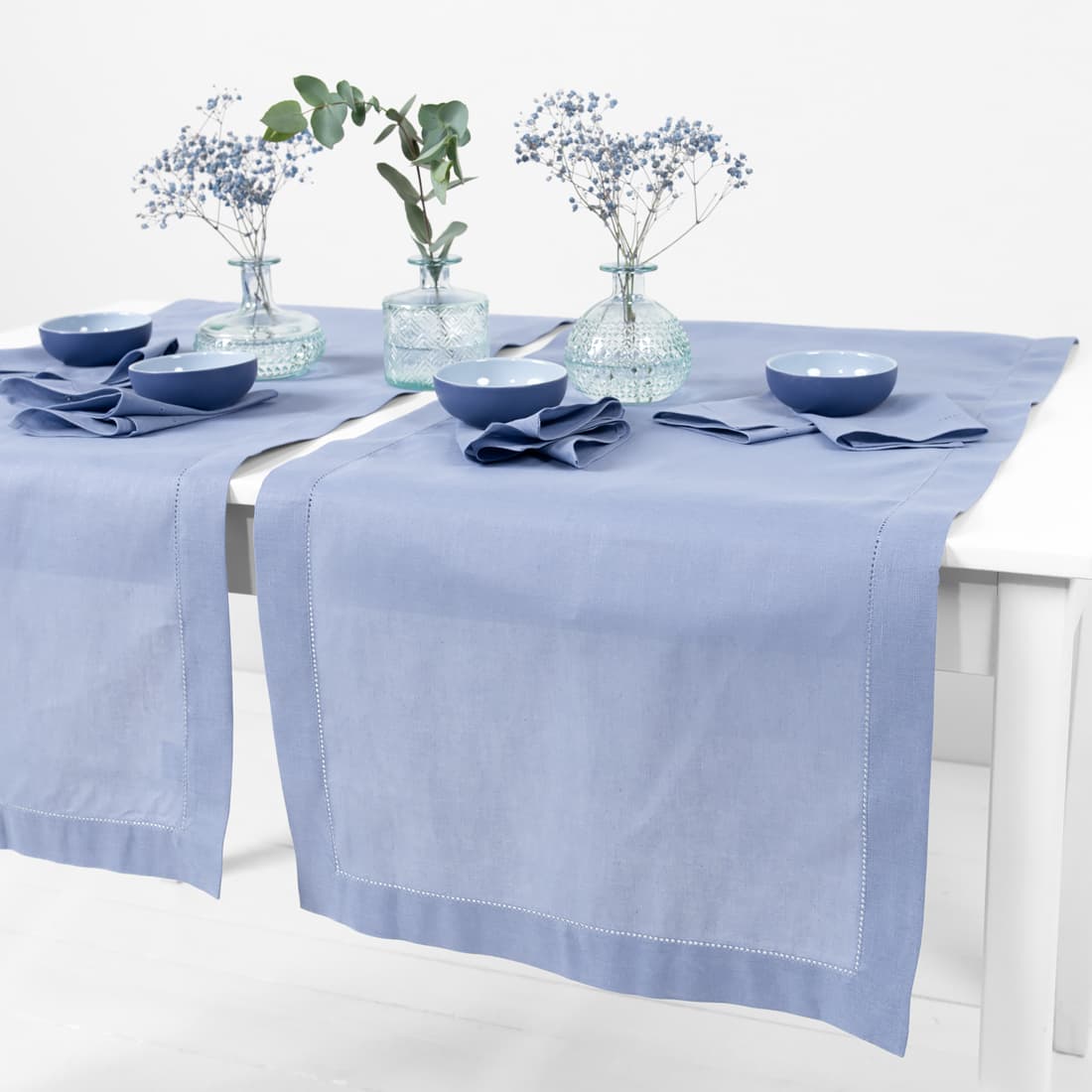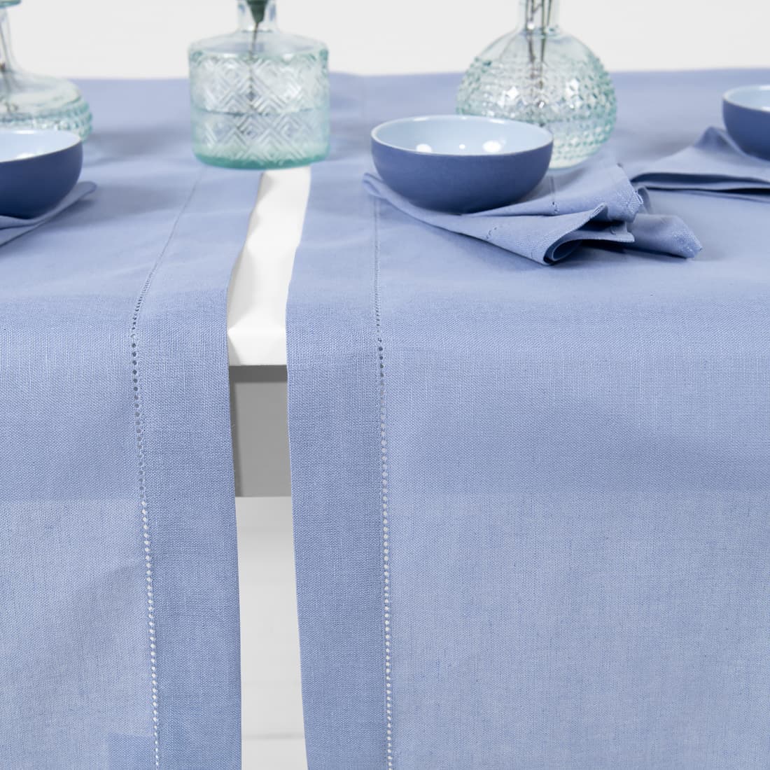 • Halbleinen-Tischläufer himmelblau mit 4cm breitem Umschlagsaum und Hohlsaum