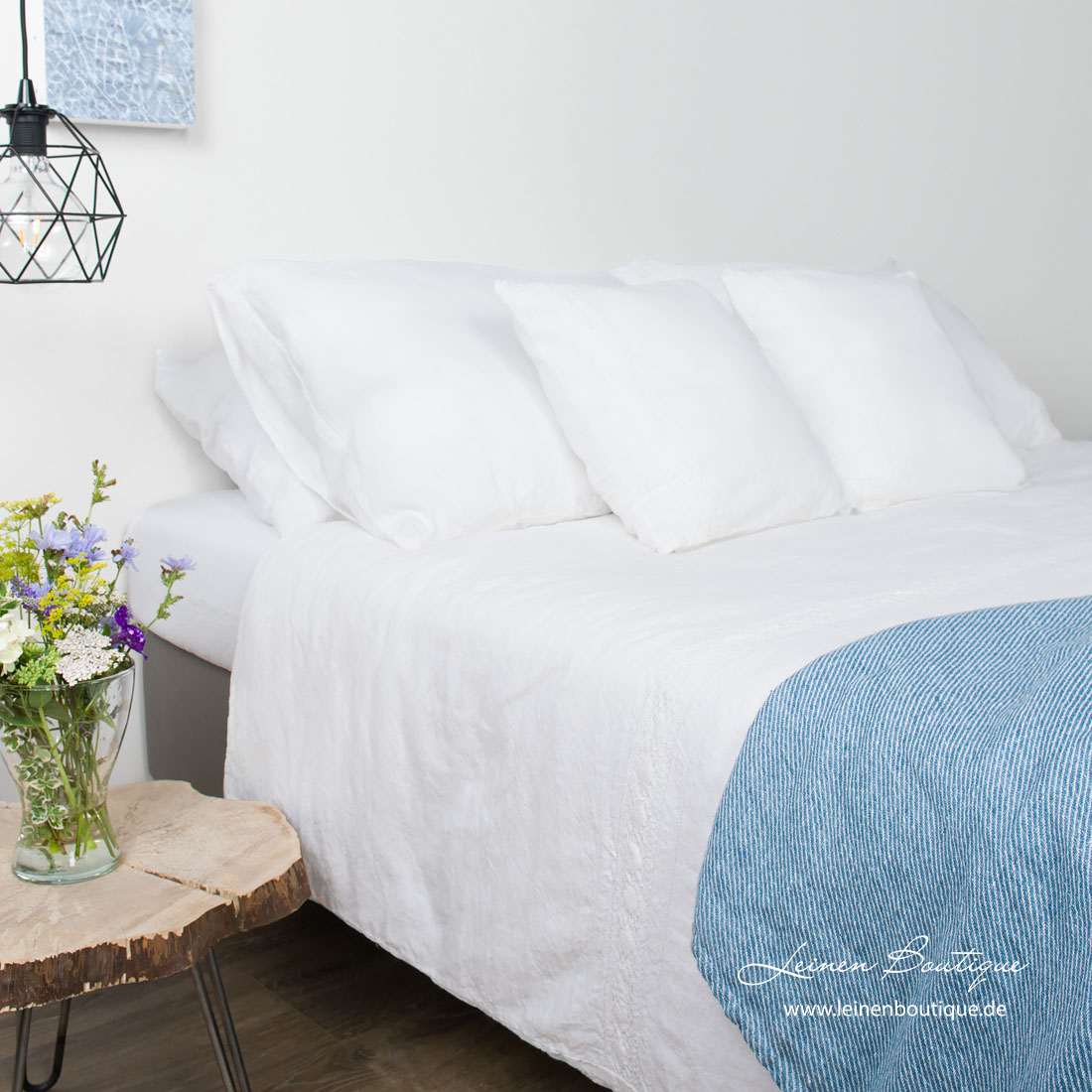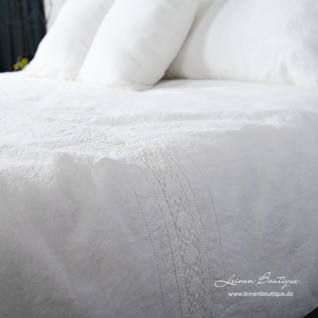- Schneeweißer Bettbezug mit Leinenspitze mit Knopfverschluss unten.