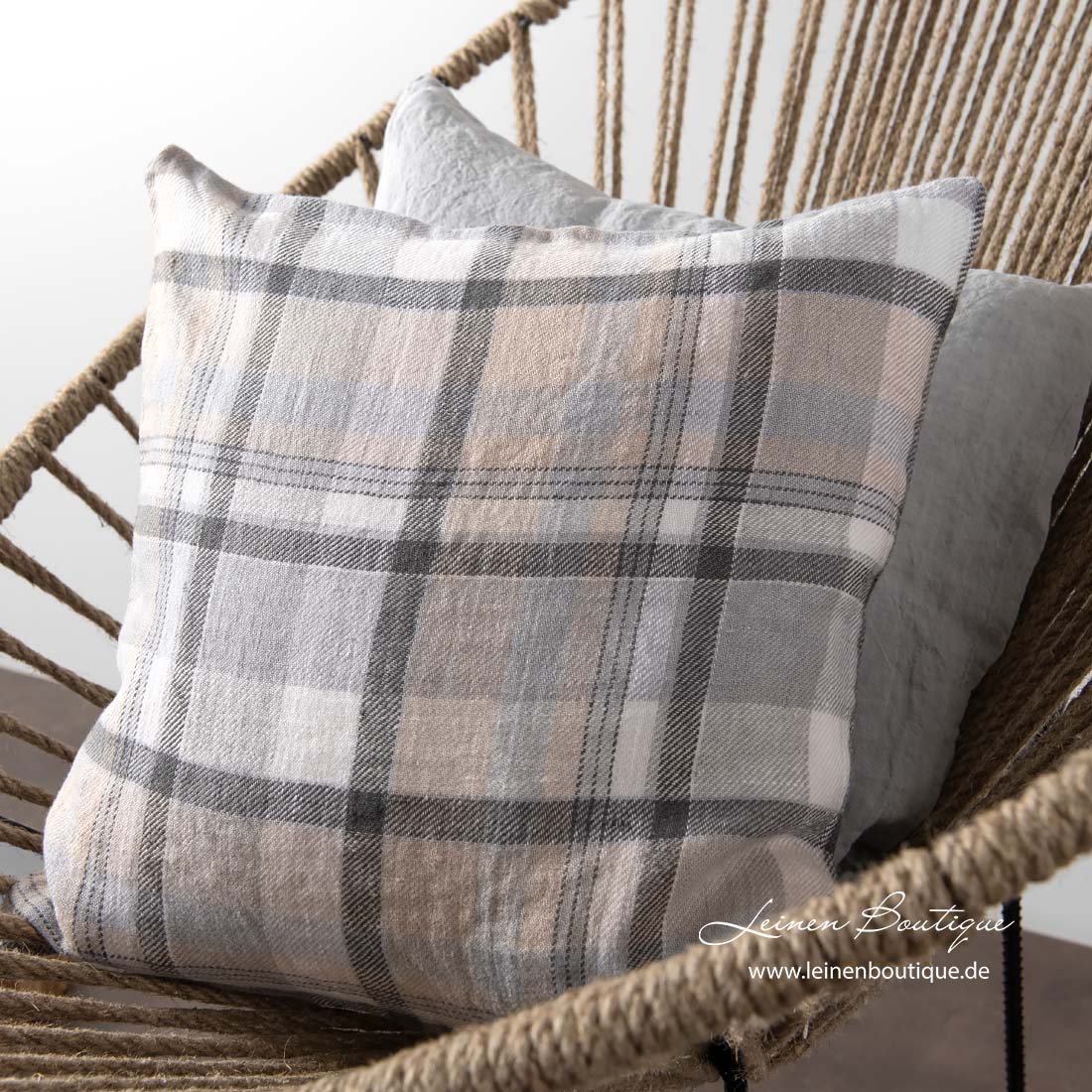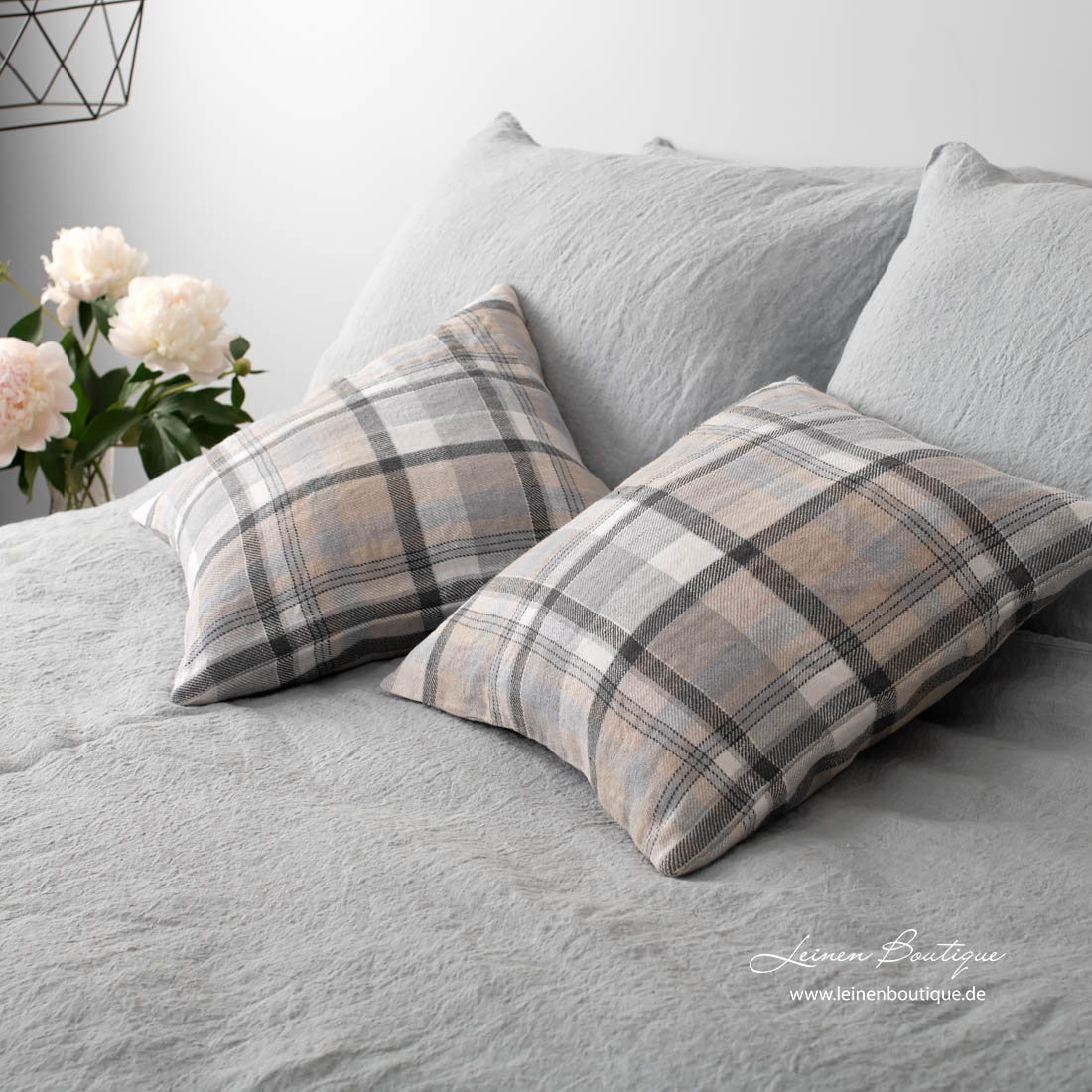 Leinen-Kissenhülle grau kariert (Grau in einigen Tönen), mit schneeweißen, bräunlichen Karos verschönert. Lässt sich mit einem Reißverschluss schließen. Die Kissenhülle ist aus speziell vorgewaschenem Reinleinen angefertigt. Wir waschen die Stoffe, damit die Artikel weich, geschmeidig sind, beim Waschen zu Hause nicht mehr einlaufen. Wir empfehlen Ihr Sofa, Bett nicht nur mit einigen Deko-Kissen, sondern auch mit Leinenplaid in demselben Design zu verschönern.